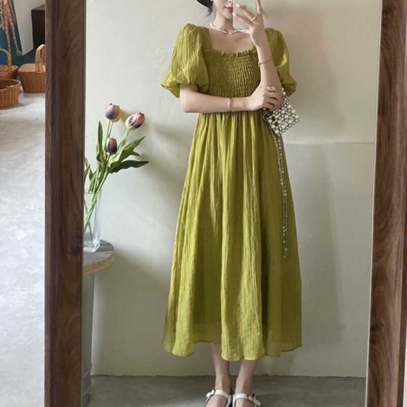 Модное дизайнерское платье, большой размер, в корейском стиле, тренд сезона, квадратный вырез, А-силуэт, высокая талия