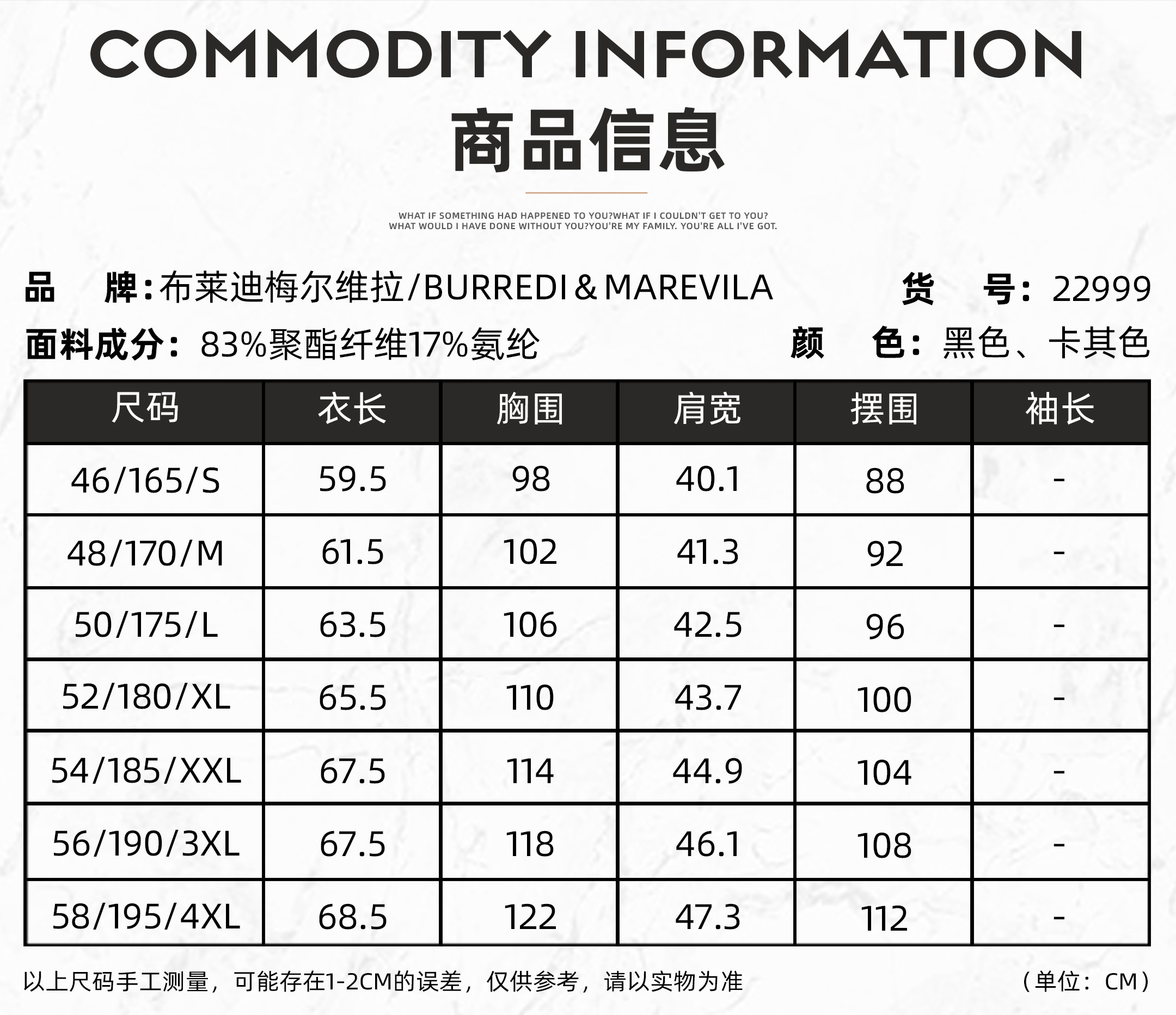 | Размер: | 46/165/S, 48/170/M, 50/175/L, 52/180/XL, 54/185/XXL, 56/190/XXXL, 58/195/XXXXL, Код точного размера, пожалуйста, проконсультируйтесь с обслуживанием клиентов |