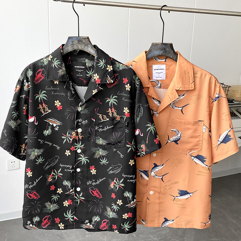 Алохан рубашка!Летний мужской летний ретро -принт с коротким шорт -рубашкой кубинской воротничкой 14306