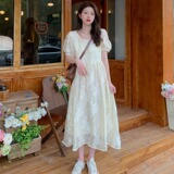 Милая длинная юбка, шифоновое платье, большой размер, французский стиль, в корейском стиле, рукава фонарики, квадратный вырез