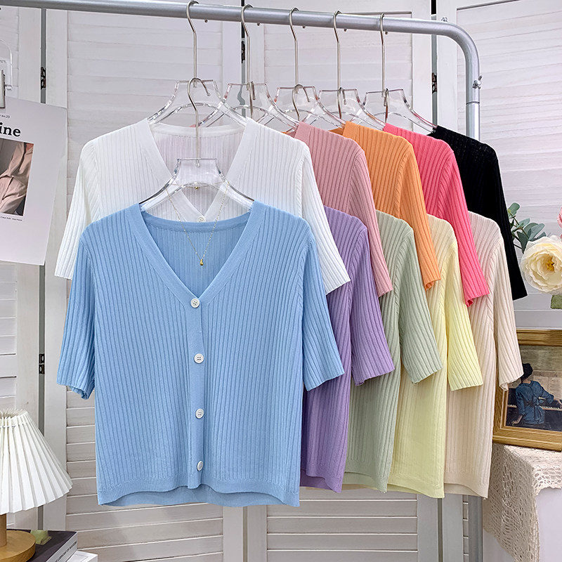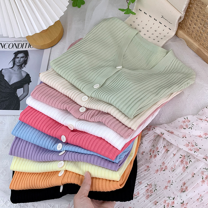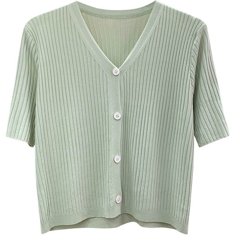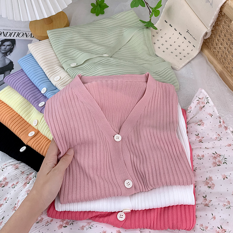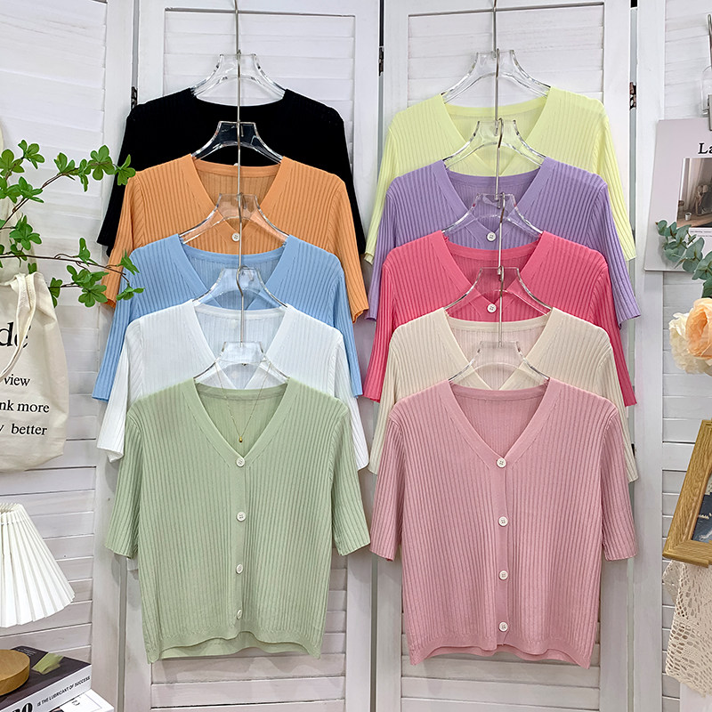Шелковый трикотажный тонкий кардиган, изысканный стиль, V-образный вырез, в западном стиле, защита от солнца