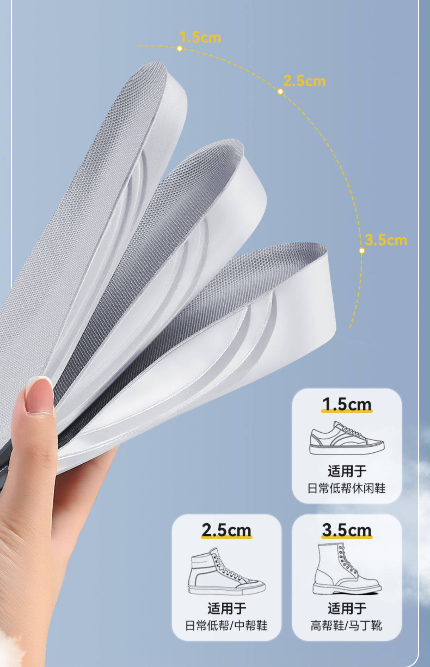 Цвет: [1 пара 1,5 см] Мягкое эластичное движение увеличивает высоту., [1 пара 2,5 см] Мягкое эластичное движение для увеличения роста, [1 пара 3,5 см] Мягкое эластичное движение для увеличения роста, [2 пары 1,5 см] Мягкое эластичное движение увеличивает высоту., [2 пары 2,5 см] Мягкое эластичное движение увеличивает высоту., [2 пары 3,5 см] Мягкое эластичное движение увеличивает высоту., 【1,5+2,5】 Мягкие бомбы увеличились, [1,5+3,5] Увеличение мягких бомб, [2,5+3.5] Движение мягких бомб увеличивается