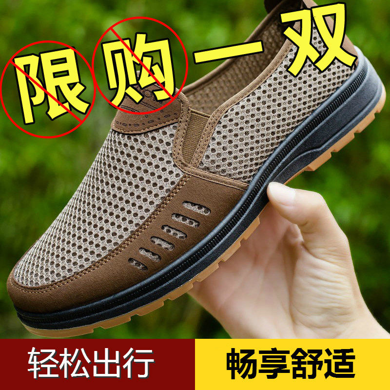 Летние старые пекинские тканевые туфли для мужчин, новые дышащие повседневные туфли для папы с сухожильной подошвой, туфли среднего и пожилого возраста с дезодорантом и сеткой без шнуровки.