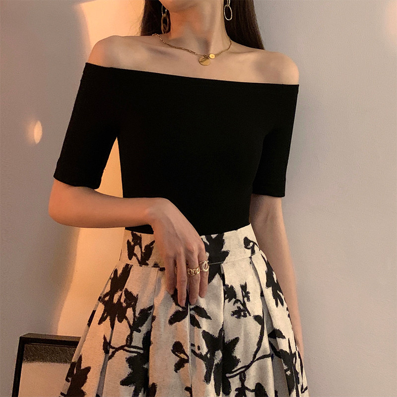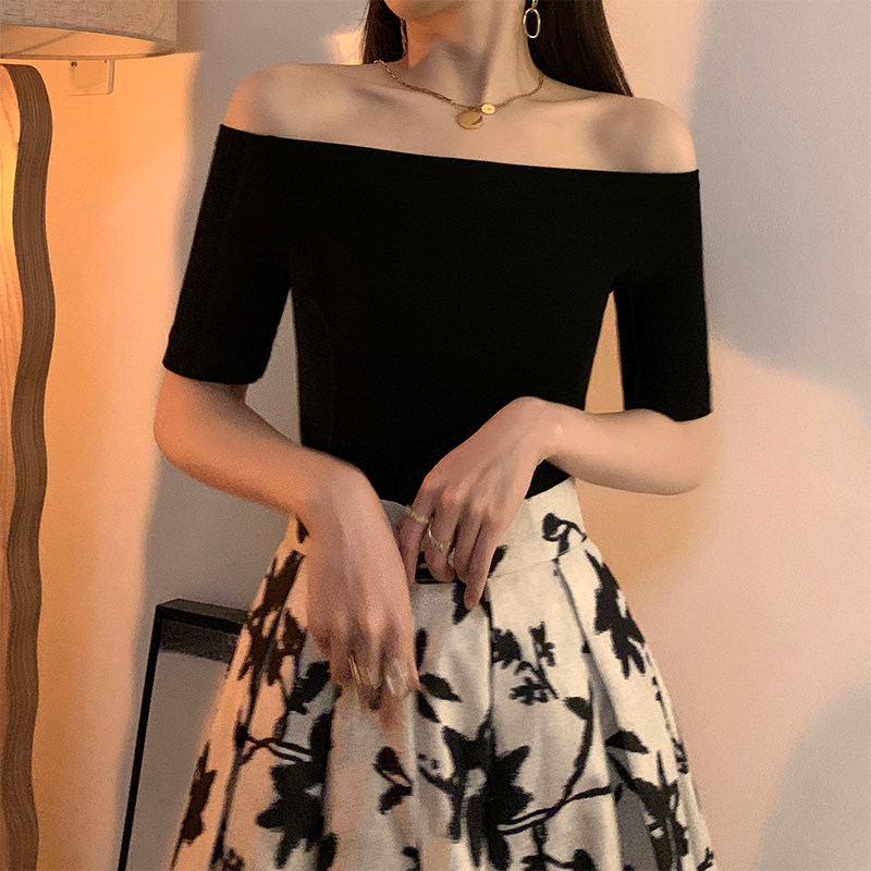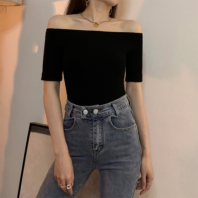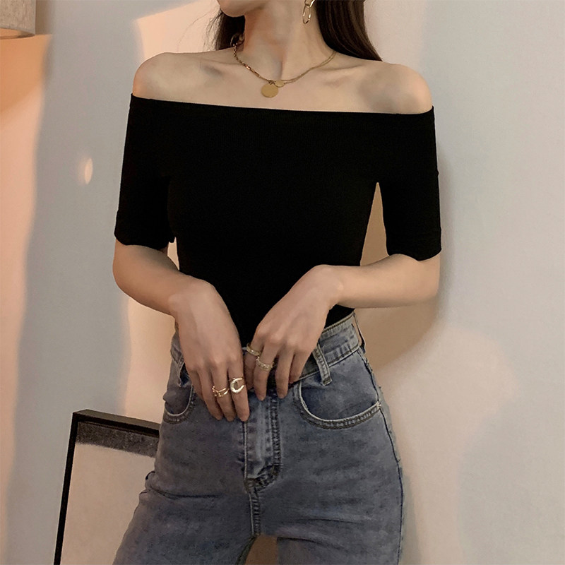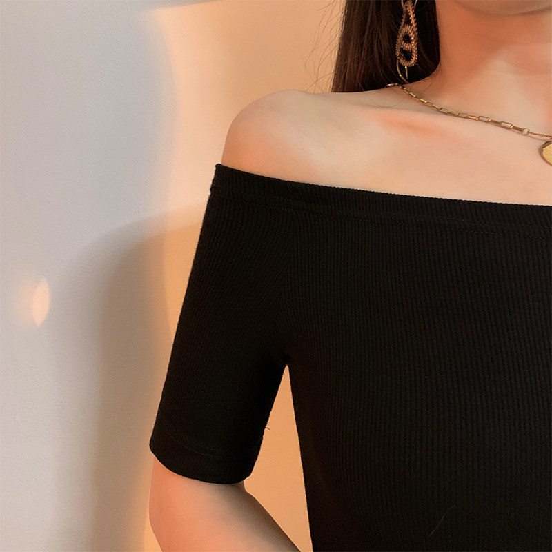Черная летняя приталенная базовая приятная телу сексуальная футболка, открытые плечи, короткий рукав