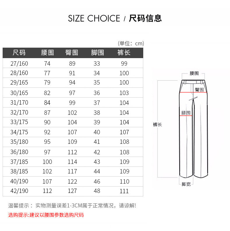 | Размер: | 29/165 (окружность талии 79/брюки длиной 100), 30/165 (окружность талии 82/брюки длиной 103), 31/170 (окружность талии 84/брюки длиной 103), 32/170 (окружность талии 87/брюки длиной 104), 33/175 (окружность талии 90/брюки длиной 104), 34/175 (окружность талии 92/брюки длиной 107), 35/180 (окружность талии 95/брюки длиной 108), 36/180 (окружность талии 97/брюки длиной 108), 38/185 (окружность талии 102/брюки длиной 109), 46/165 (мальчик 98/окружность талии 88), 48/170 (грудастая 102/окружность талии 91), 50/175 (грудастая 106/окружность талии 95), 52/180 (грудастая 110/окружность талии 99), 54/185 (грудастая 114/окружность талии 103) |