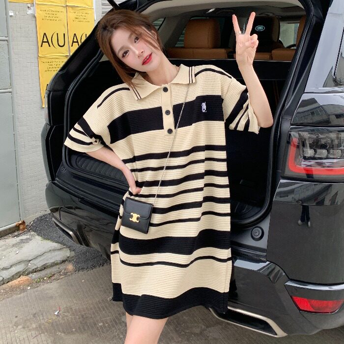 Летнее ретро трикотажное длинное платье, платье-футболка, воротник поло, средней длины, свободный крой