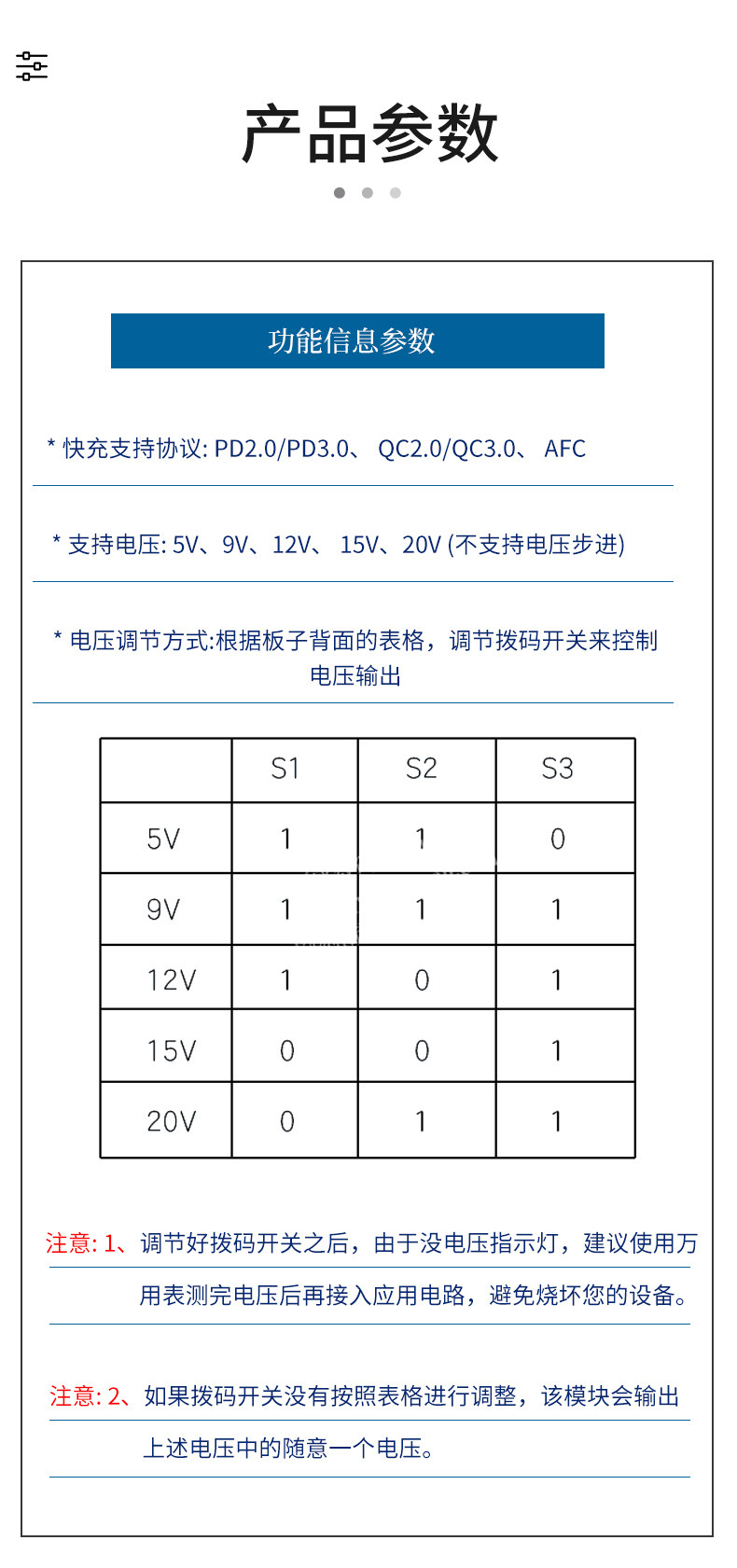 Триггер обмана быстрой зарядки PD/QC/AFC поддерживает фиксированное выходное напряжение 5 В, 9 В, 12 В, 15 В, 20 В.