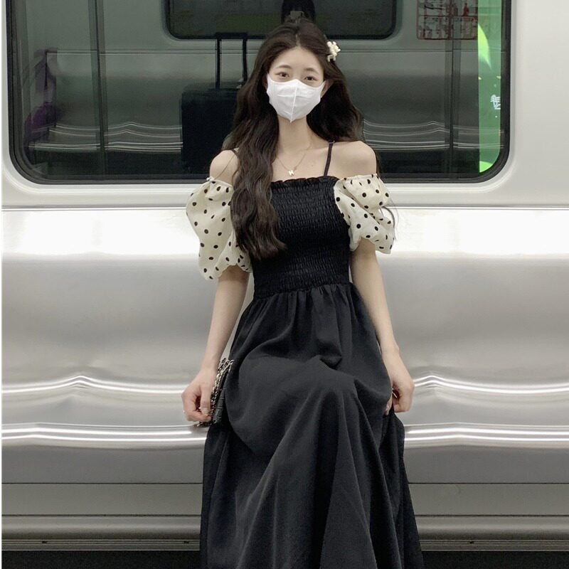 Платье, весенняя длинная юбка, большой размер, французский стиль, открытые плечи, рукава фонарики