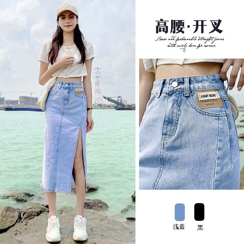 Джинсовая летняя брендовая длинная юбка, средней длины, популярно в интернете, А-силуэт, высокая талия