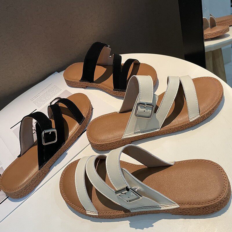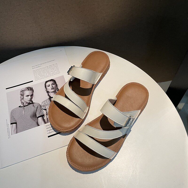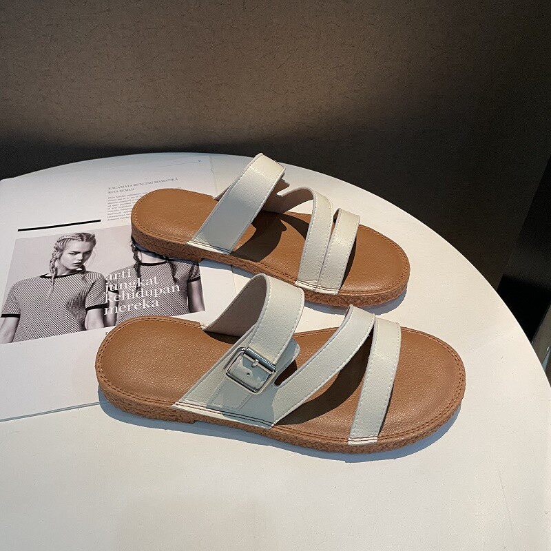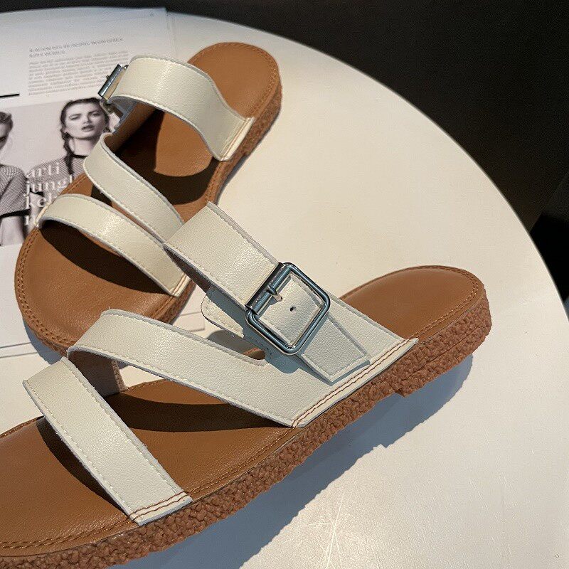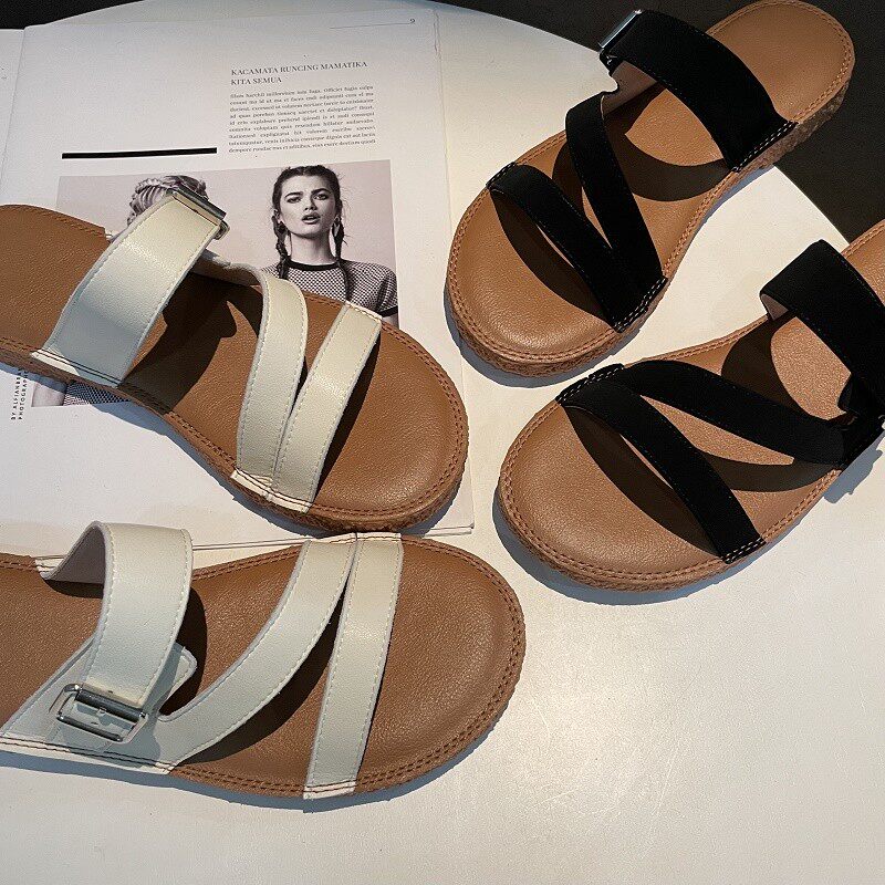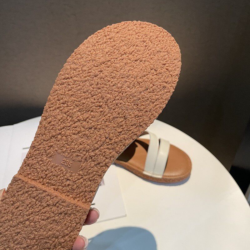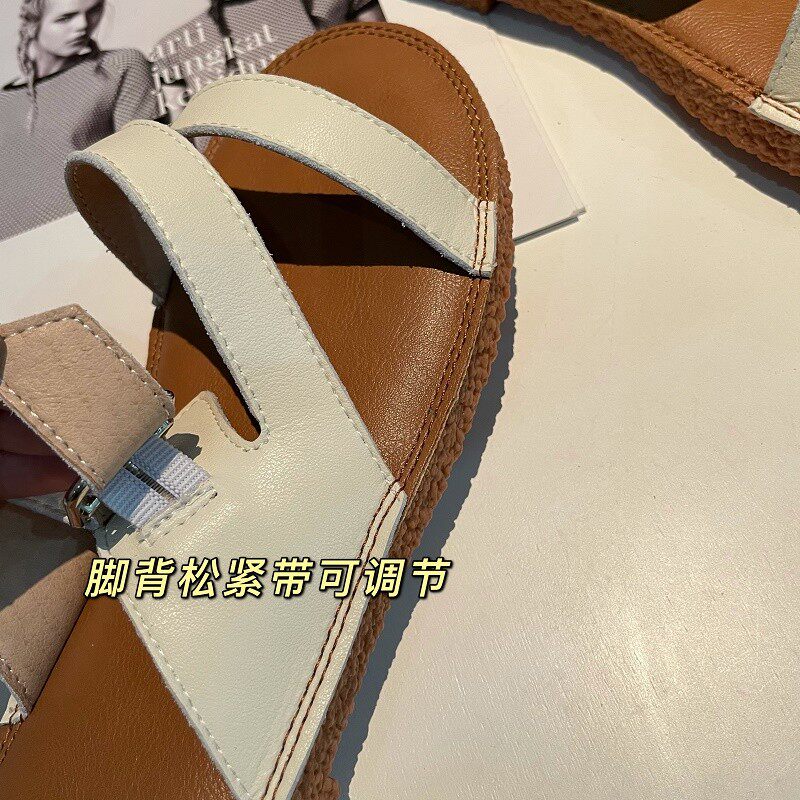 Новинка лета 2022, простой и повседневный стиль. Модные удобные женские однотонные сандалии из натуральной кожи с плоской подошвой, мягкие сандалии для верхней одежды.