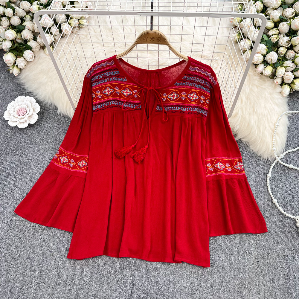 Ретро этнический мегафон с круглым воротником, нарукавники, рубашка, стиль бохо, этнический стиль, с вышивкой, из хлопка и льна, в западном стиле, оверсайз
