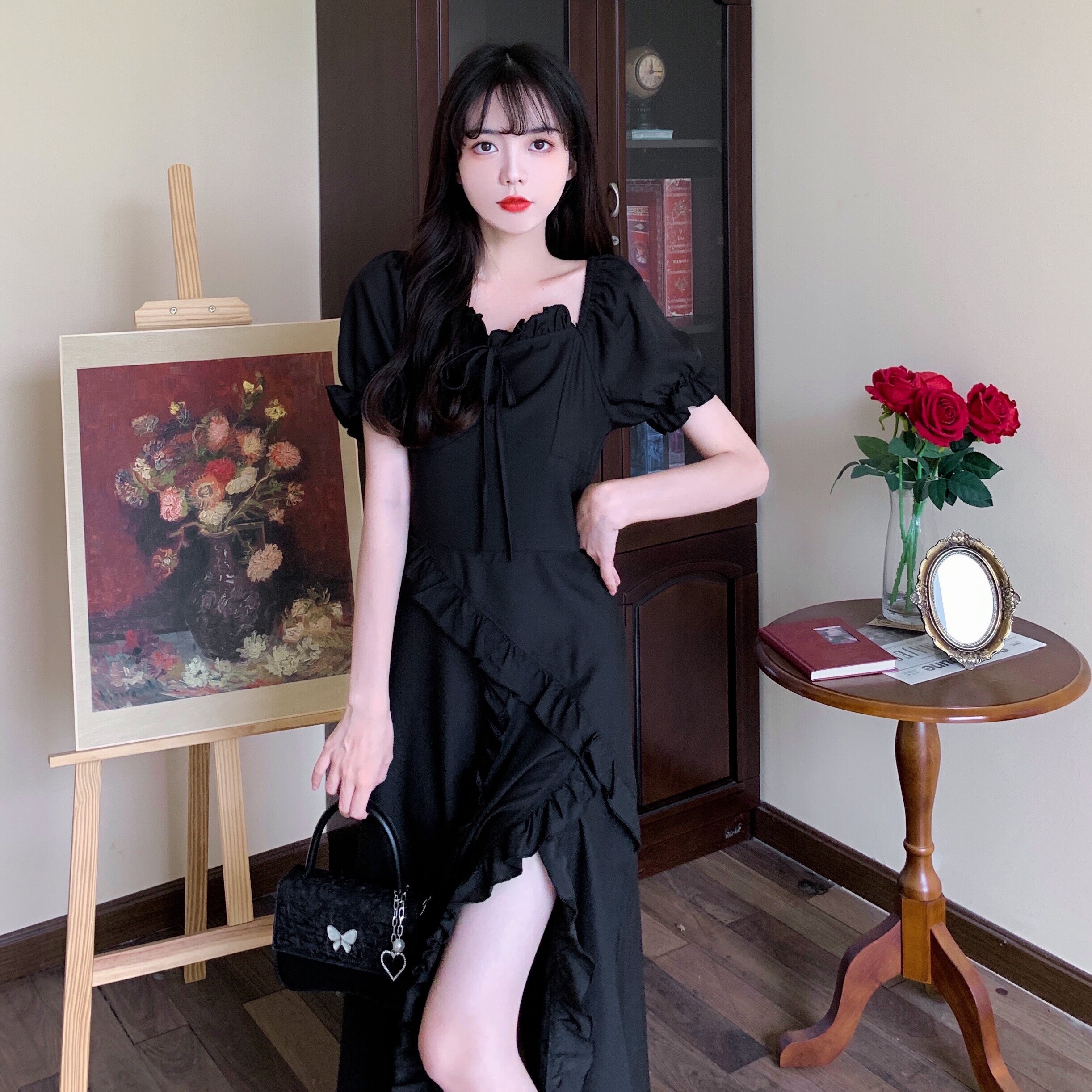 Платье, черная длинная юбка, большой размер, по фигуре, квадратный вырез, изысканный стиль