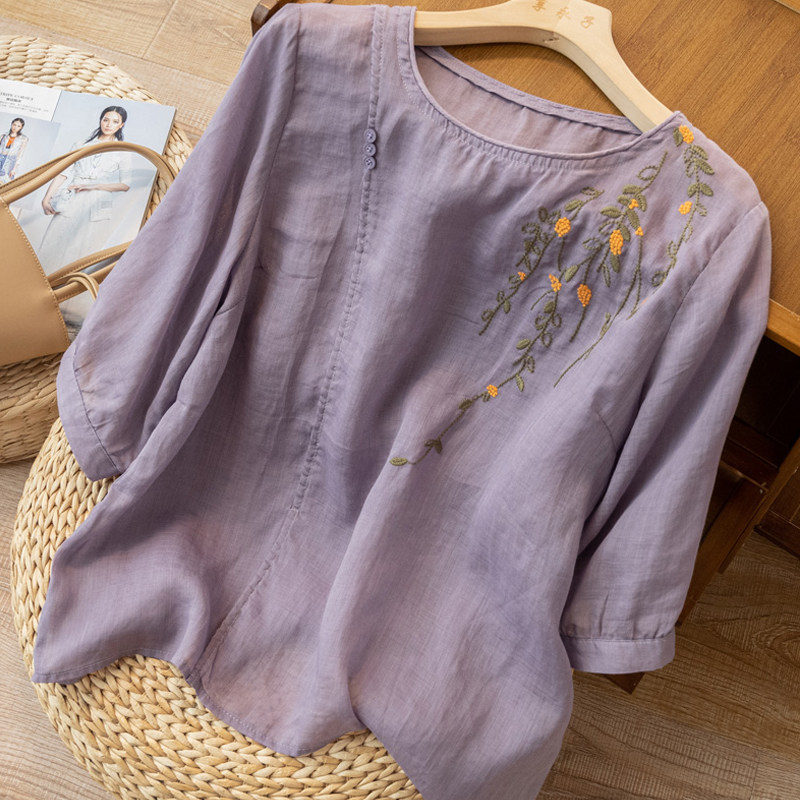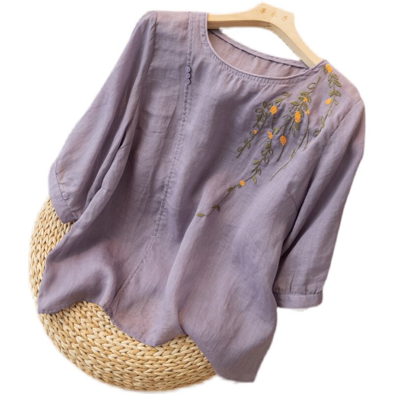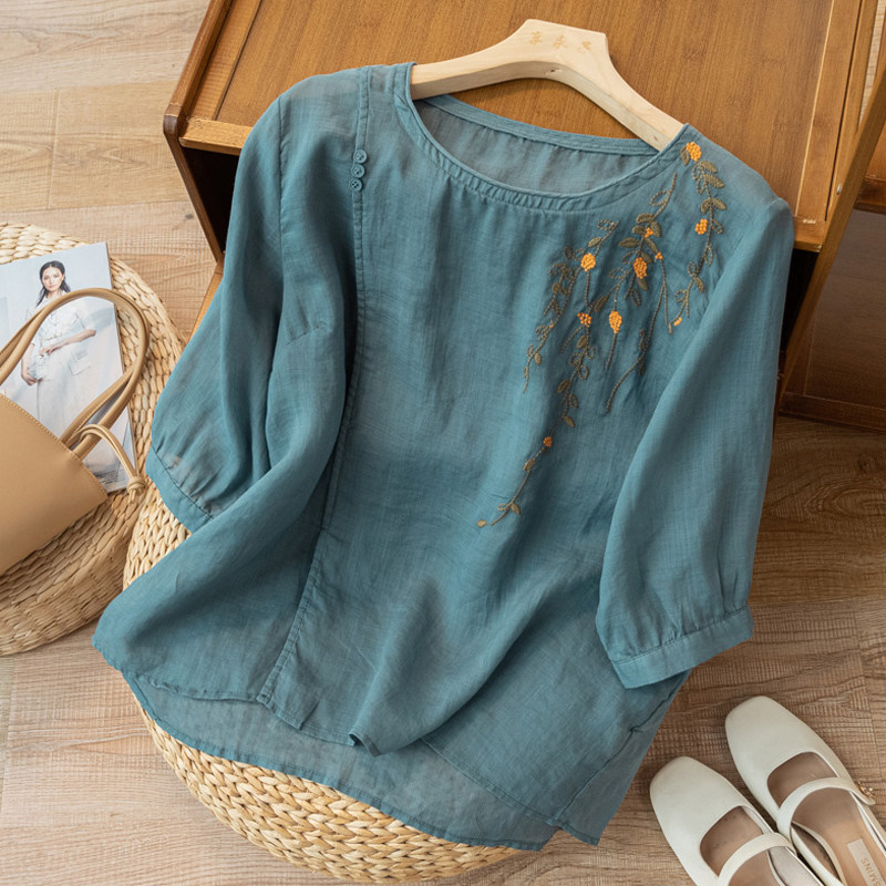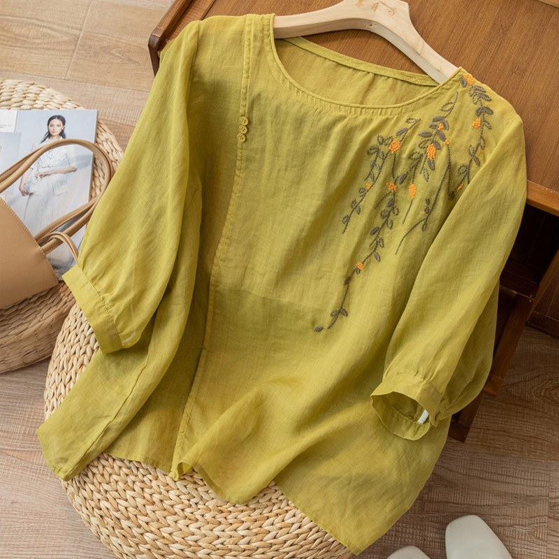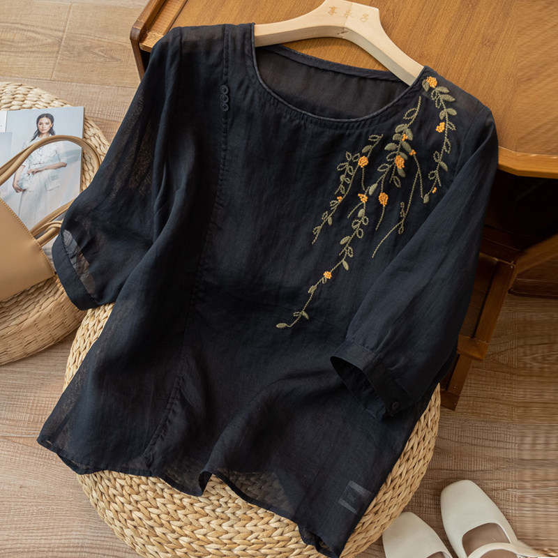 Летняя тонкая оригинальная рубашка, из хлопка и льна, китайский стиль, с вышивкой