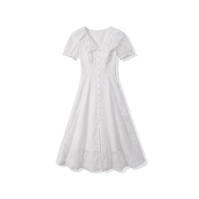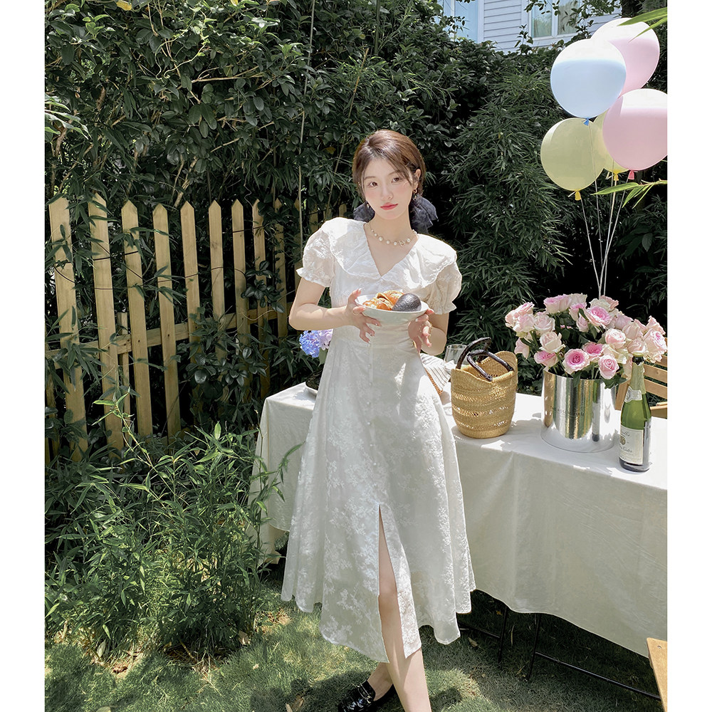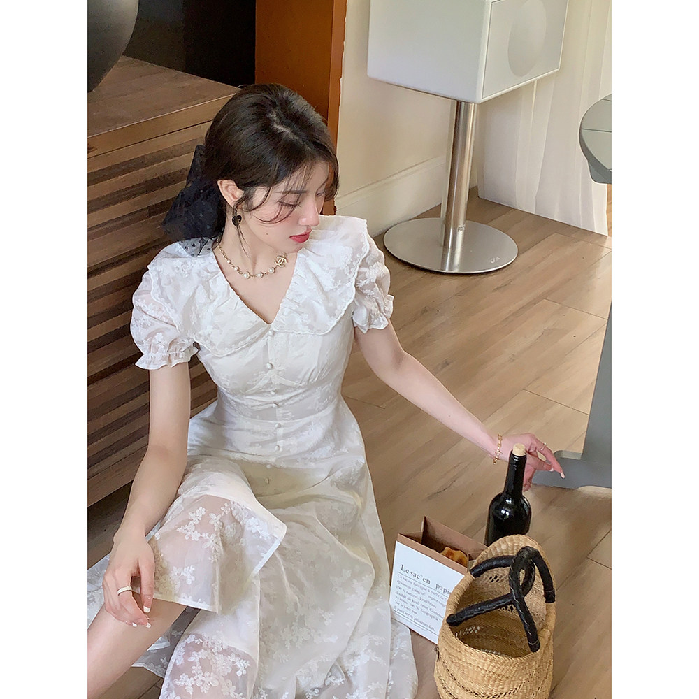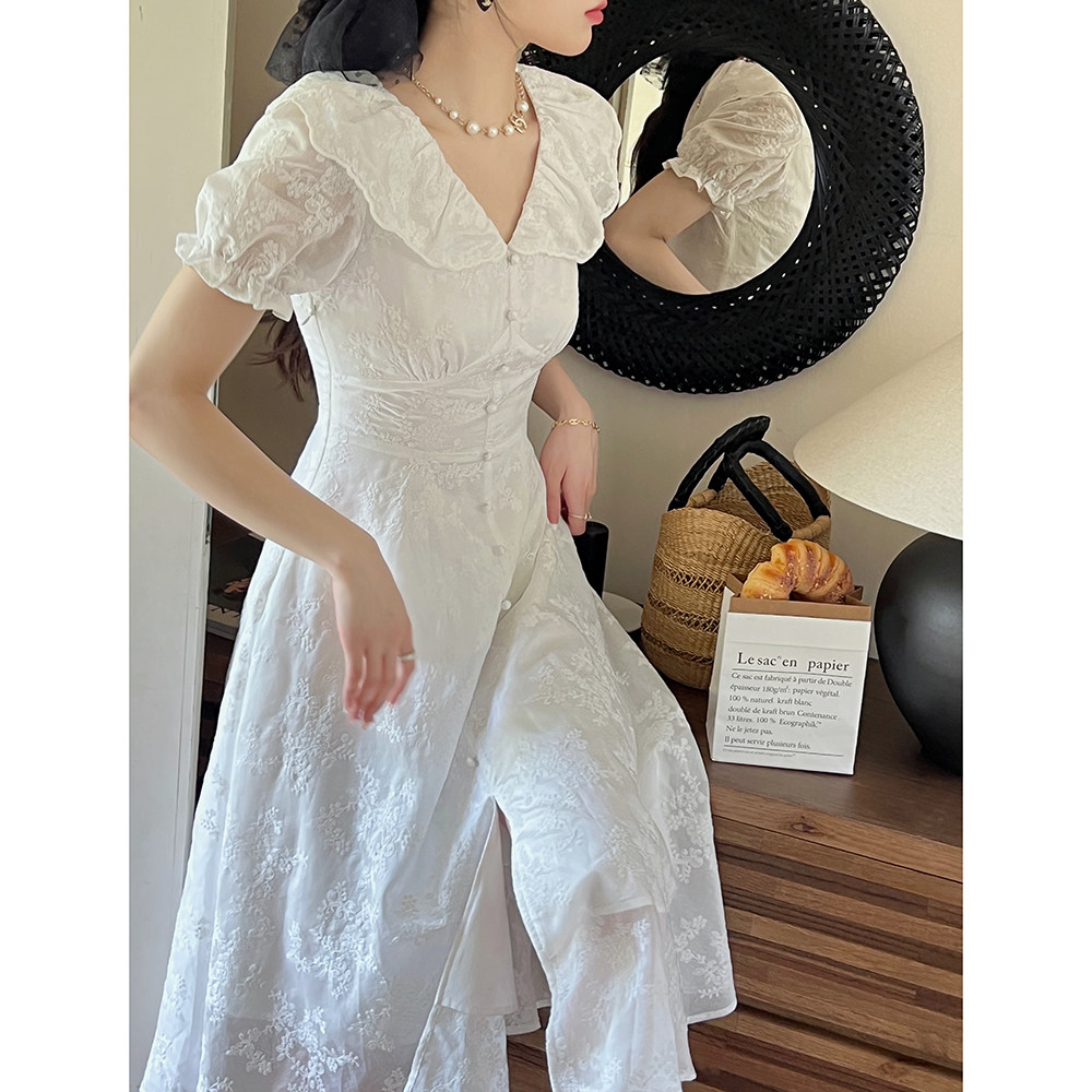 Белое элегантное платье, длинная юбка, с вышивкой, французский стиль, рукава фонарики