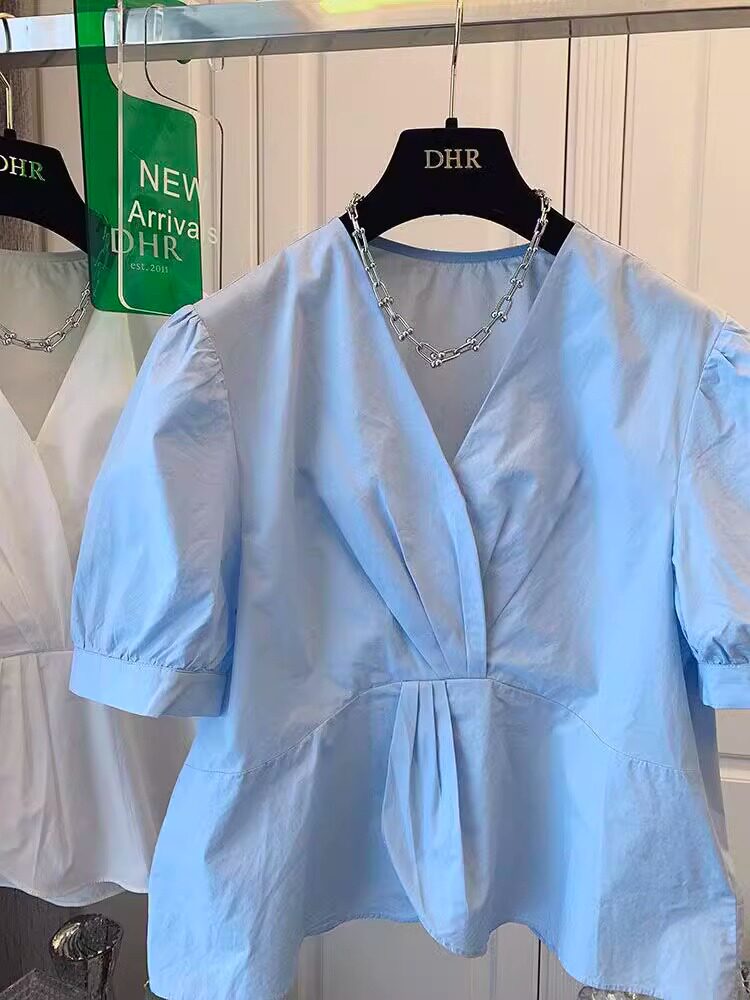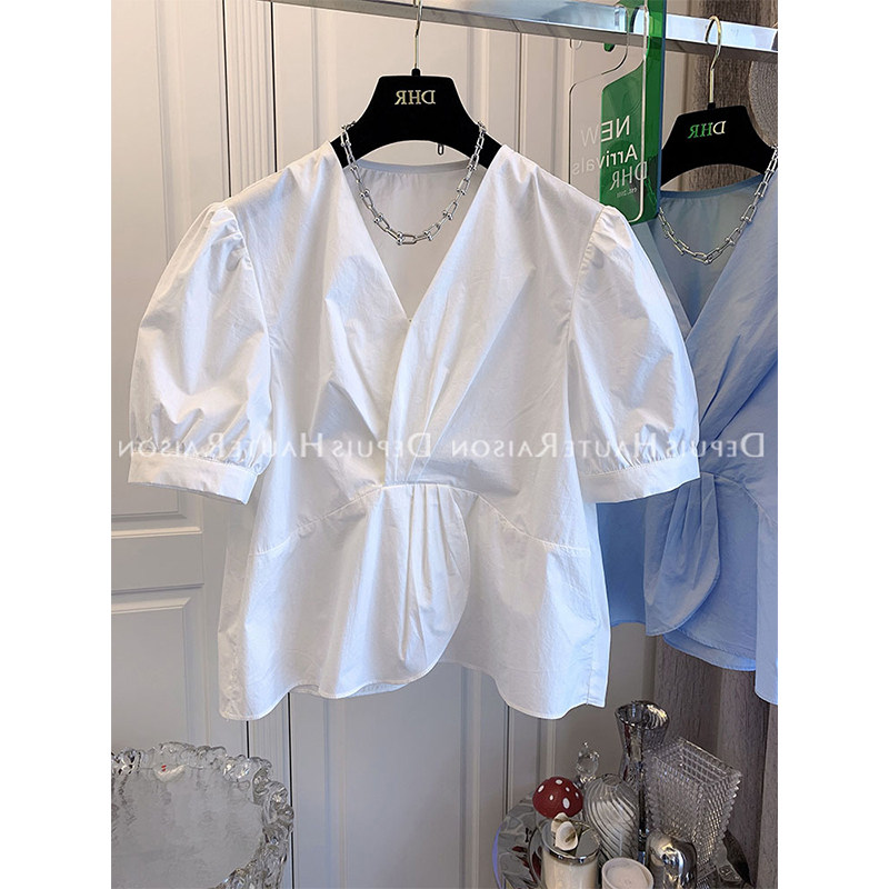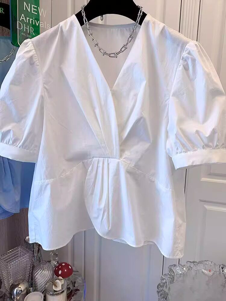 Белая тонкая рубашка, приталенный корсет, кукла, французский стиль, рукава фонарики, V-образный вырез