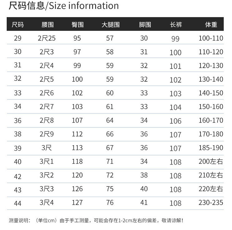 | Размер: | 29 ярдов (100-115 Catties), 30 ярдов (120 кот), 31 ярды (120-130 кот), 32 ярда (130-140 кот), 33 ярда (140-150 кот), 34 ярда (150-160 кот), 36 ярдов (170-180 кот), 38 ярдов (180-190 кот), 39 размеров (200 кот), 40 ярдов (205-215 Catties), 42 размера (220-230 Catties), 43 размера (240 кот), 44 размера (250 кот), << фавориты и покупка предпочтительной доставки >> |