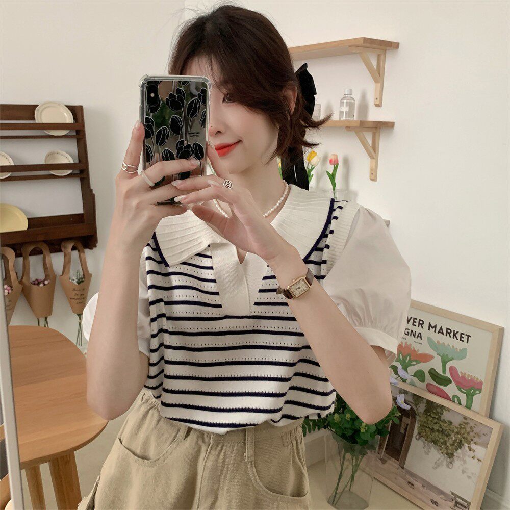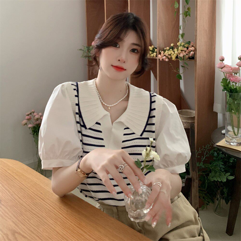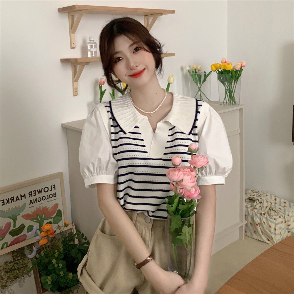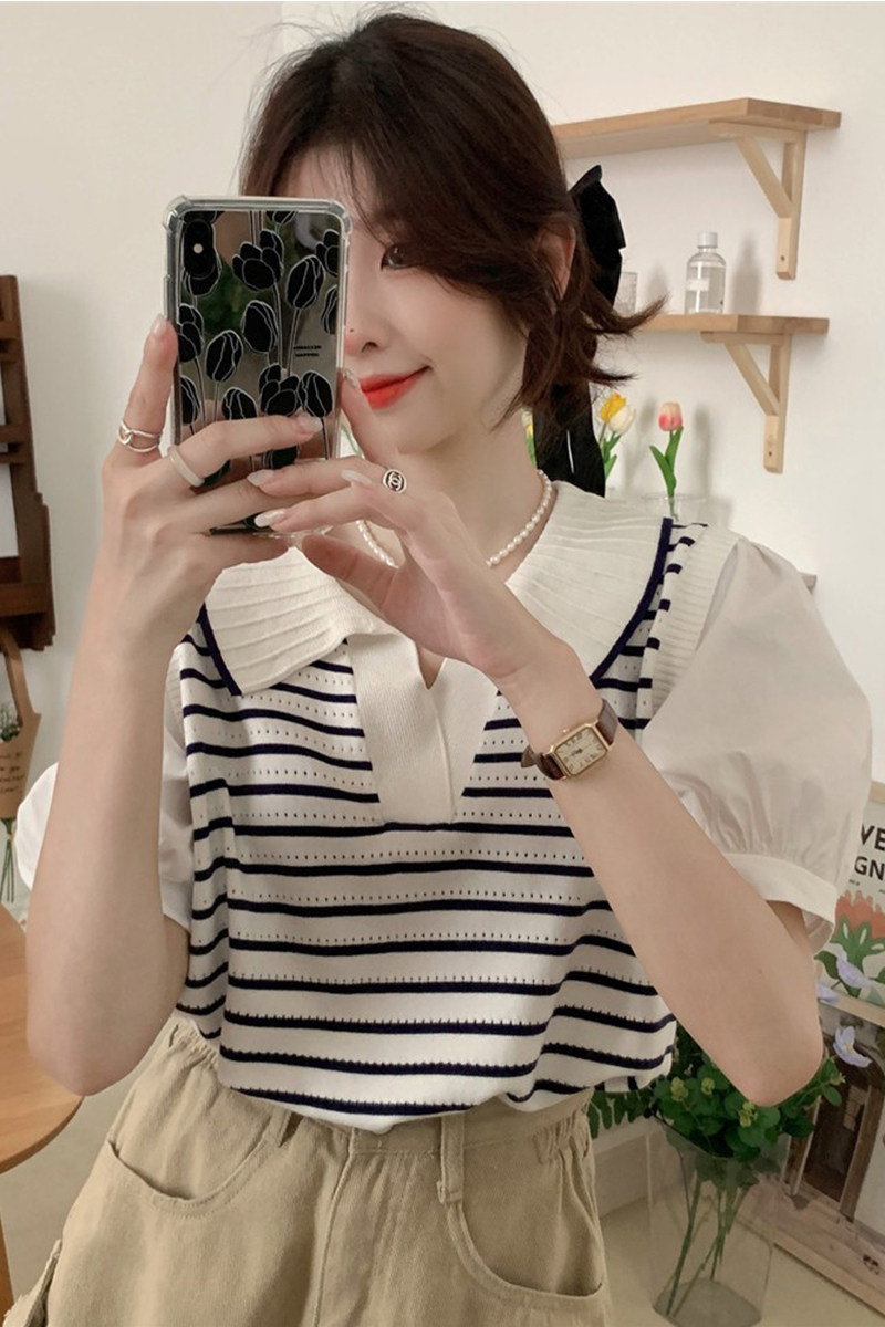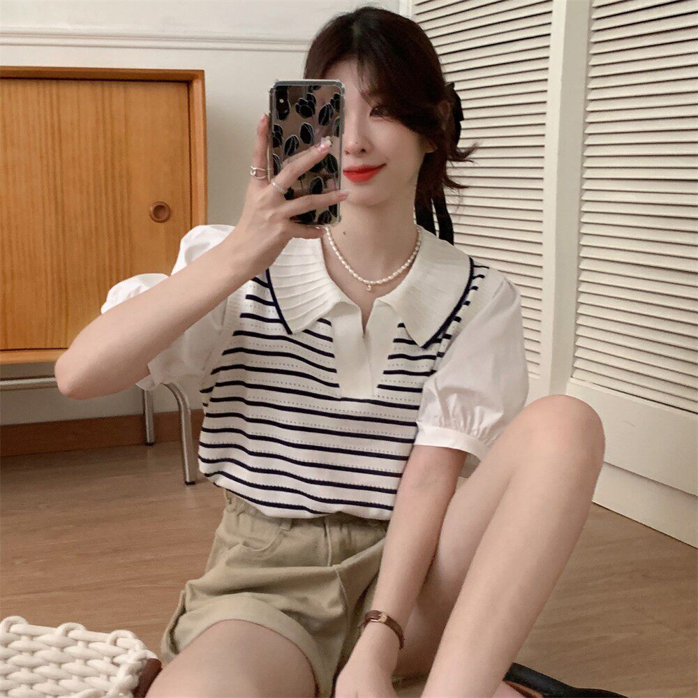Трикотажный свитер, комплект, короткая футболка с коротким рукавом, воротник поло, рукава фонарики