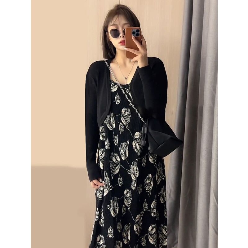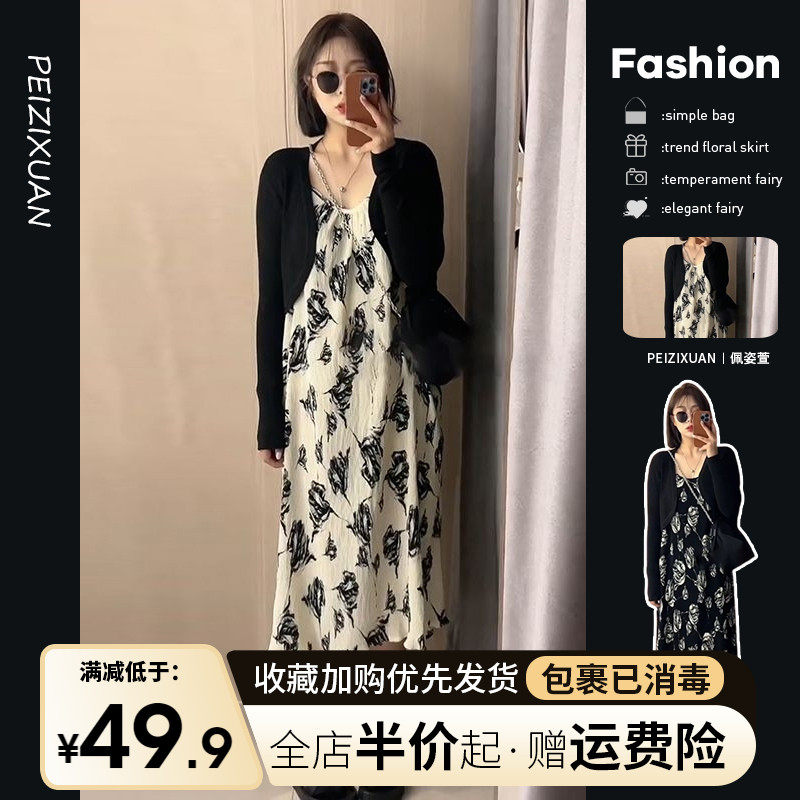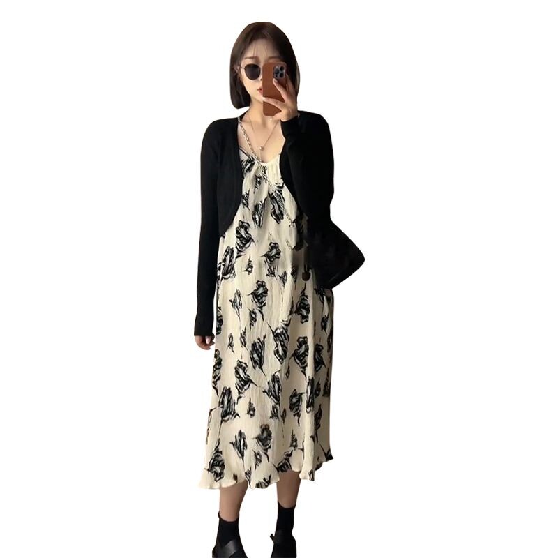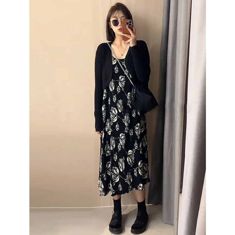 Осеннее платье, длинная юбка, коллекция 2022, французский стиль, эффект подтяжки, в цветочек, подходит для подростков, свободный крой, изысканный стиль