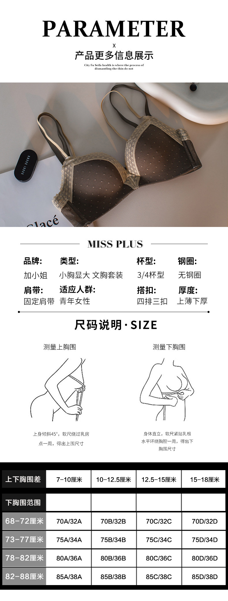 | Размер: | 32/70 (предложение 65C/70AB), 34/75 (предложение 70c/75ab), 36/80 (предложение 75C/80AB), 38/85 (рекомендуется 80C/85AB) |