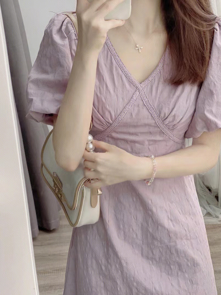 Сиреневое платье, летняя длинная юбка, подходит для подростков, французский стиль, V-образный вырез, по фигуре