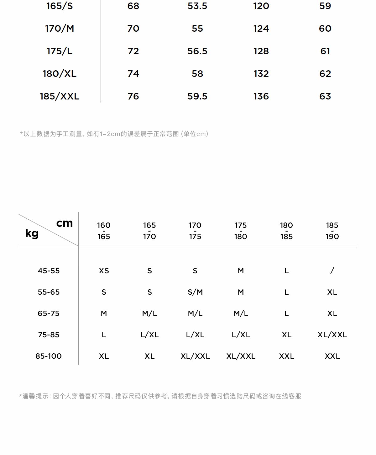 - = 185/XXL 175/L 180/XL