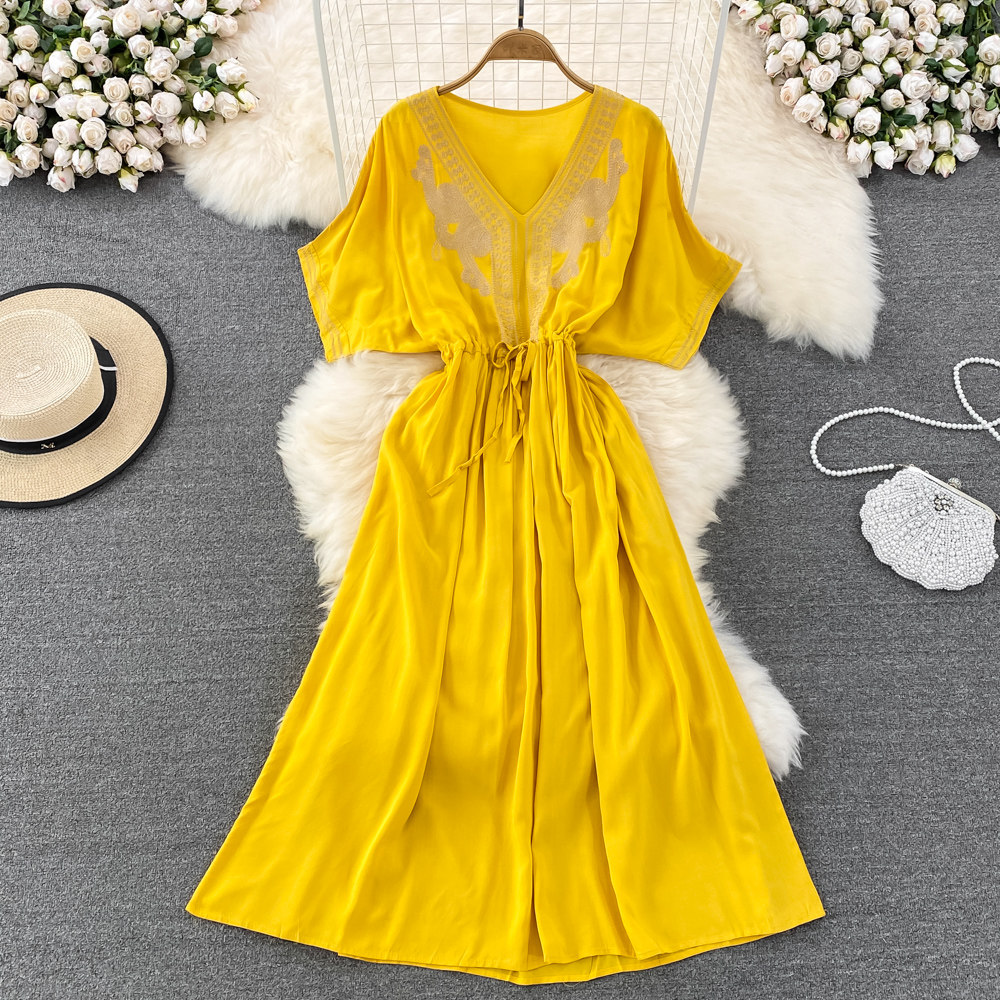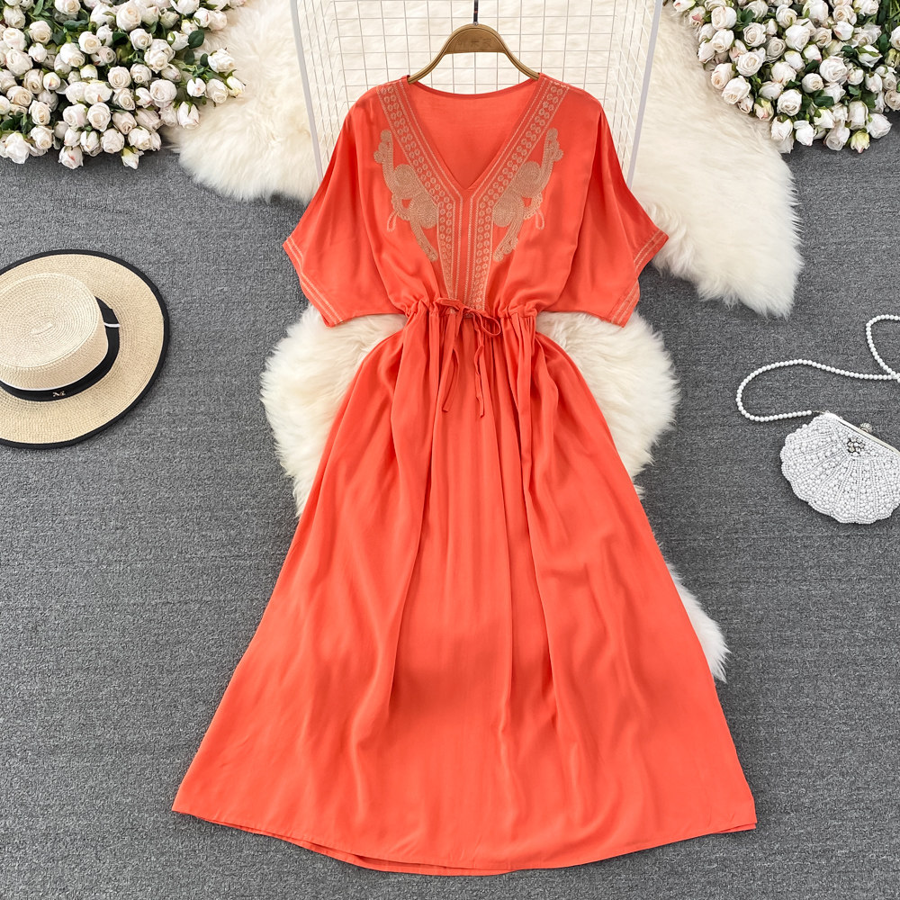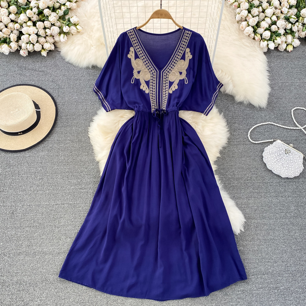 Этническое платье, длинная юбка, стиль бохо, этнический стиль, V-образный вырез, с вышивкой, свободный крой, А-силуэт