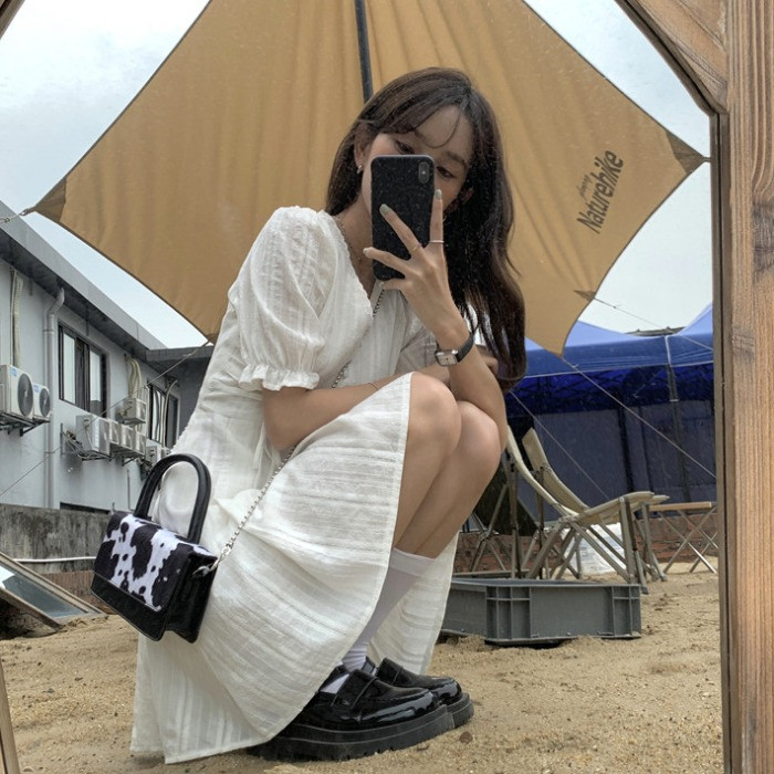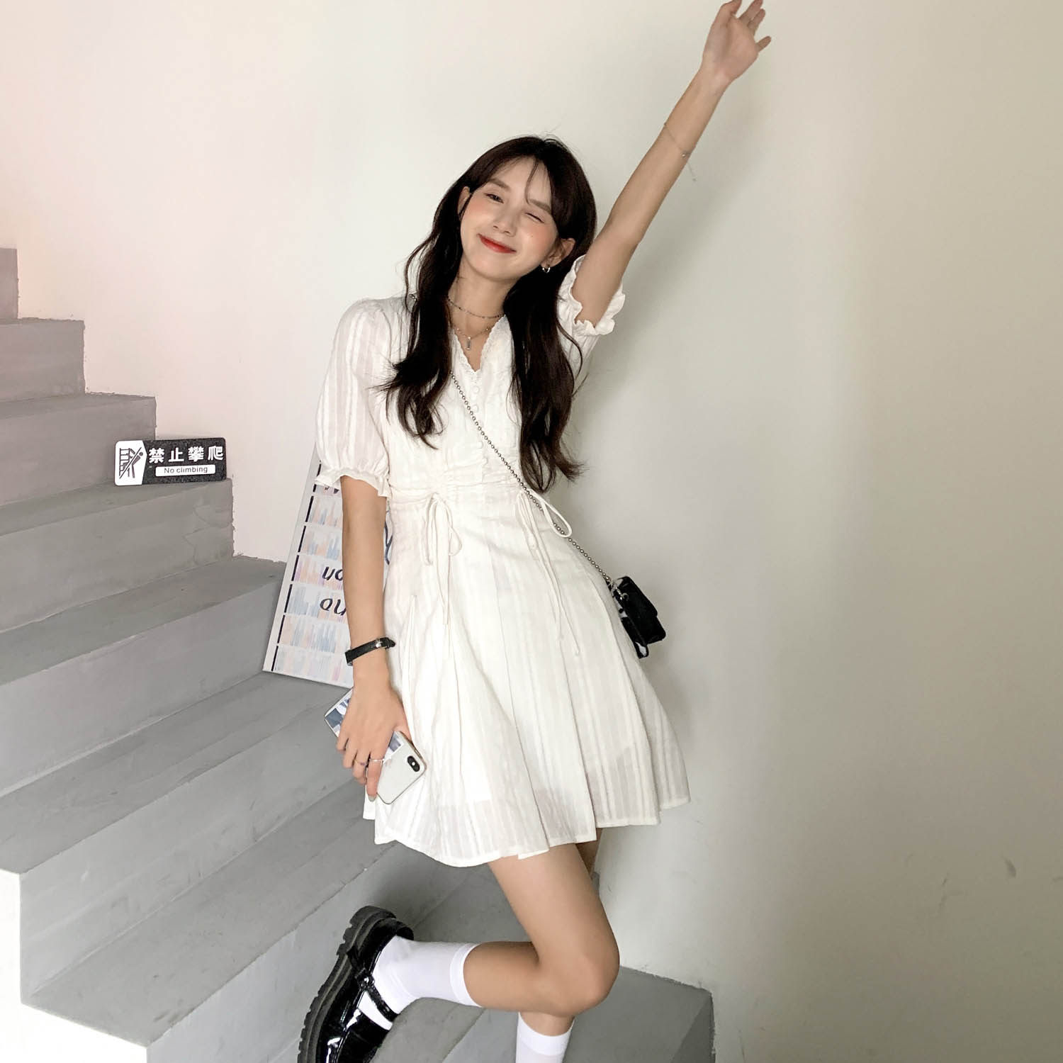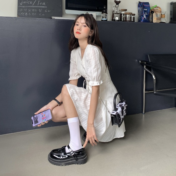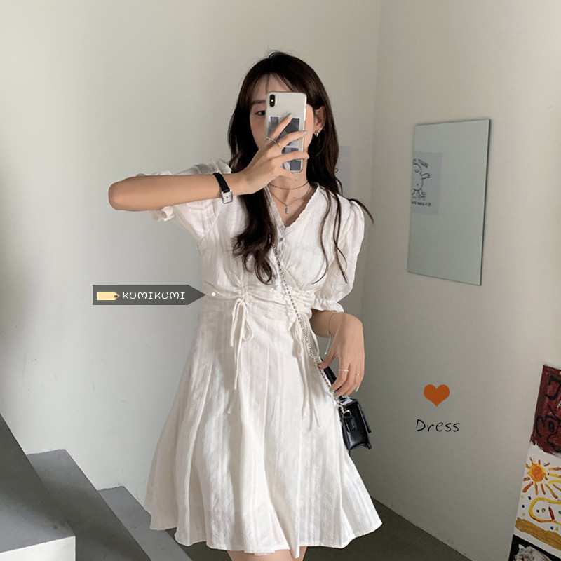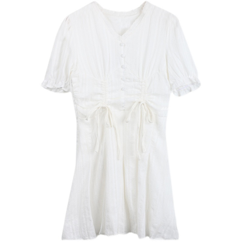 Белое платье, летняя одежда, французский стиль, V-образный вырез, на шнурках, подходит для подростков, А-силуэт