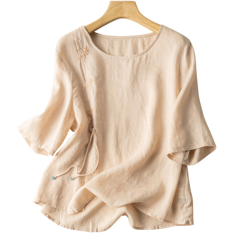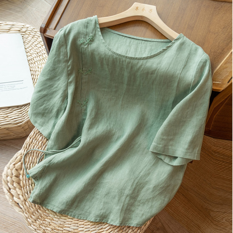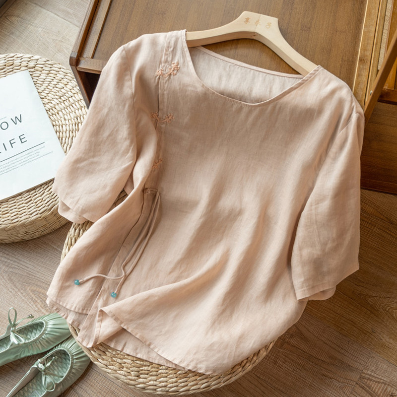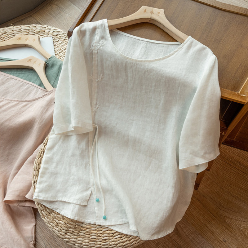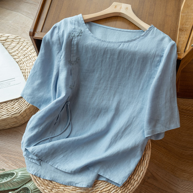 Летняя легкая и тонкая футболка с коротким рукавом, рубашка, китайский стиль, из хлопка и льна, с вышивкой