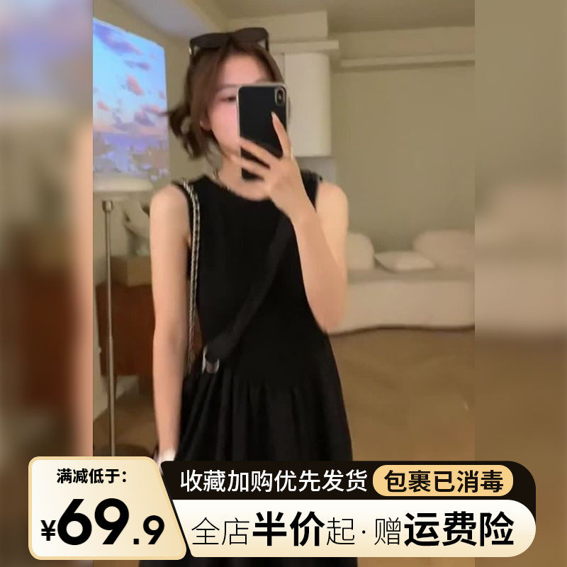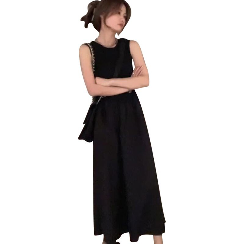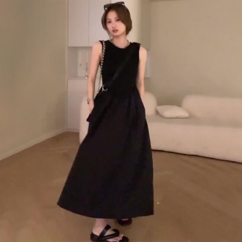 Черное летнее платье без рукавов, осенняя длинная юбка, французский стиль
