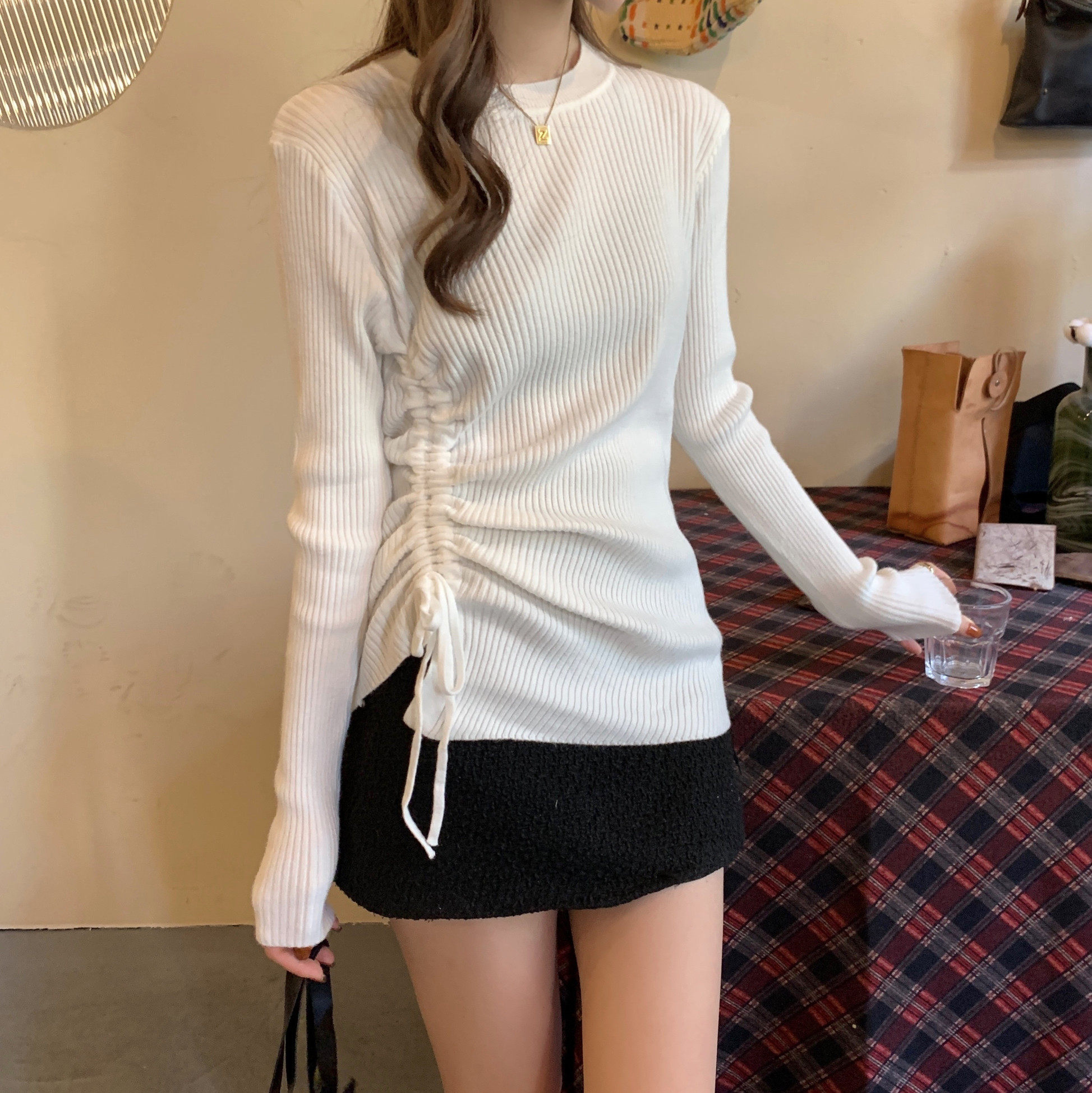 Эластичный трикотажный свитер, утепленный лонгслив, большой размер, на шнурках, облегающий крой, по фигуре