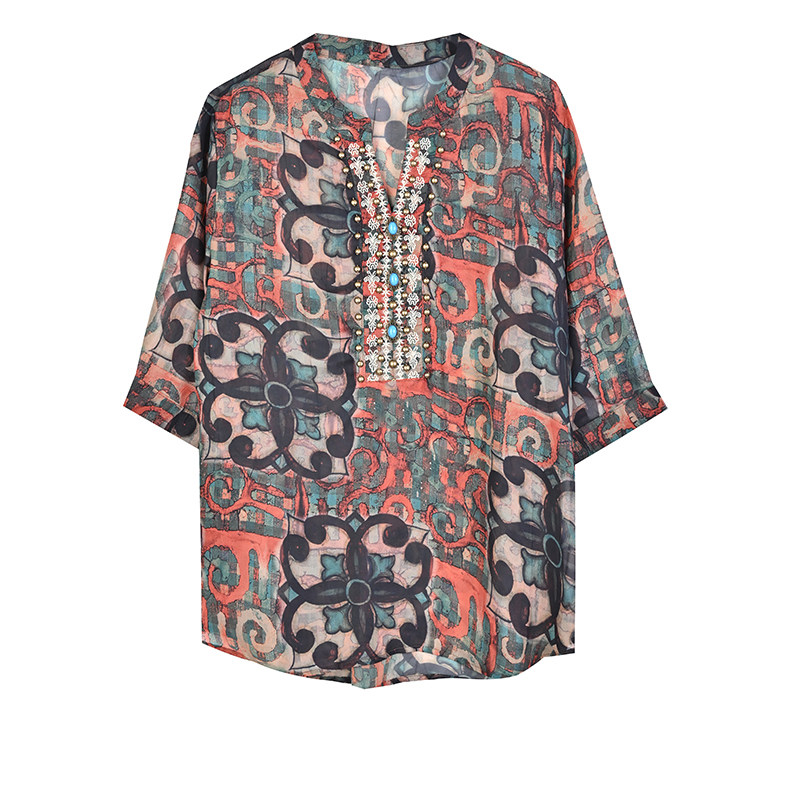 Летняя тонкая рубашка, в западном стиле, V-образный вырез, большой размер, с вышивкой