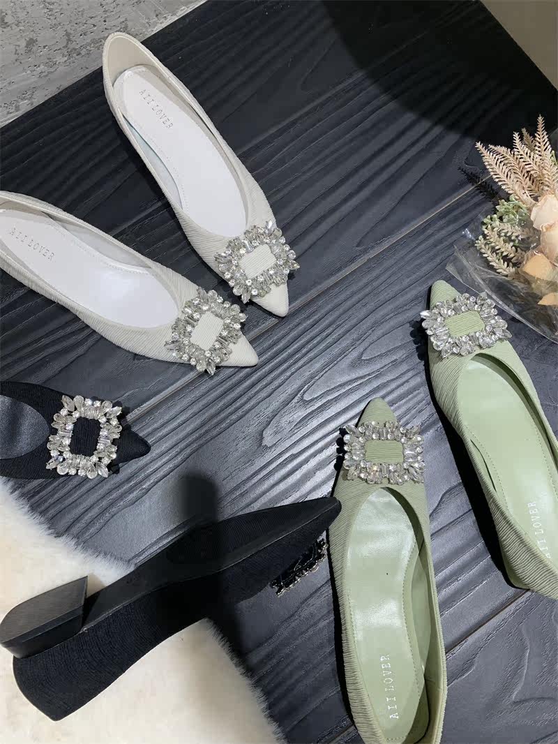 Полигональная пряжка страза с низкими каблуками.