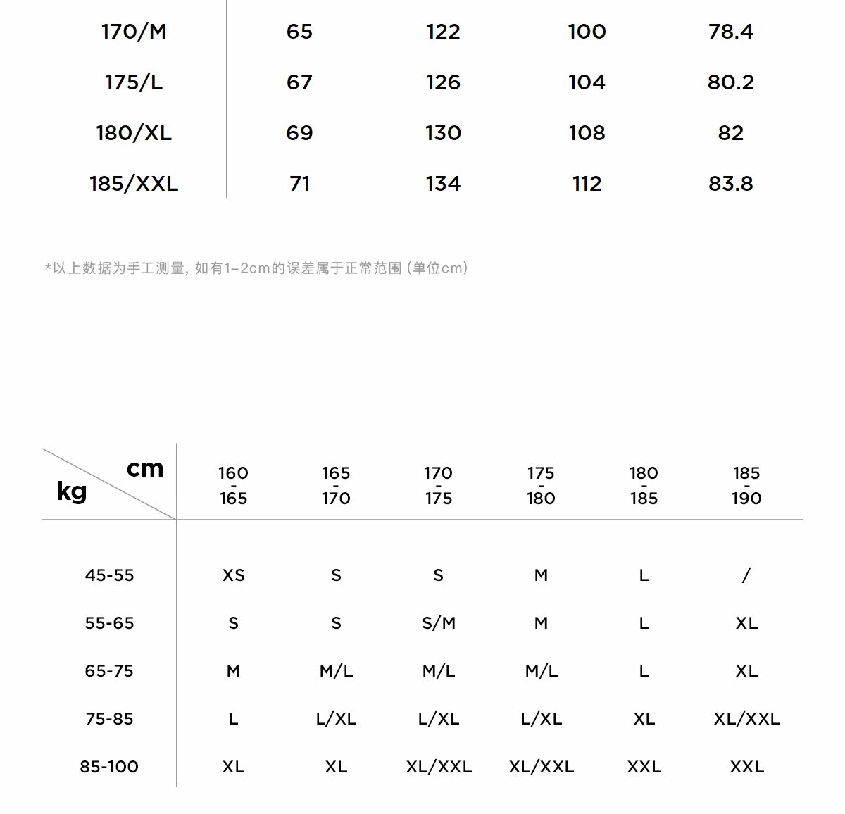 - = 185/XXL 175/L 180/XL