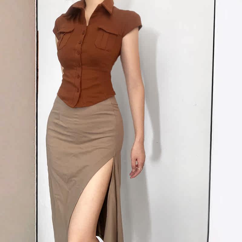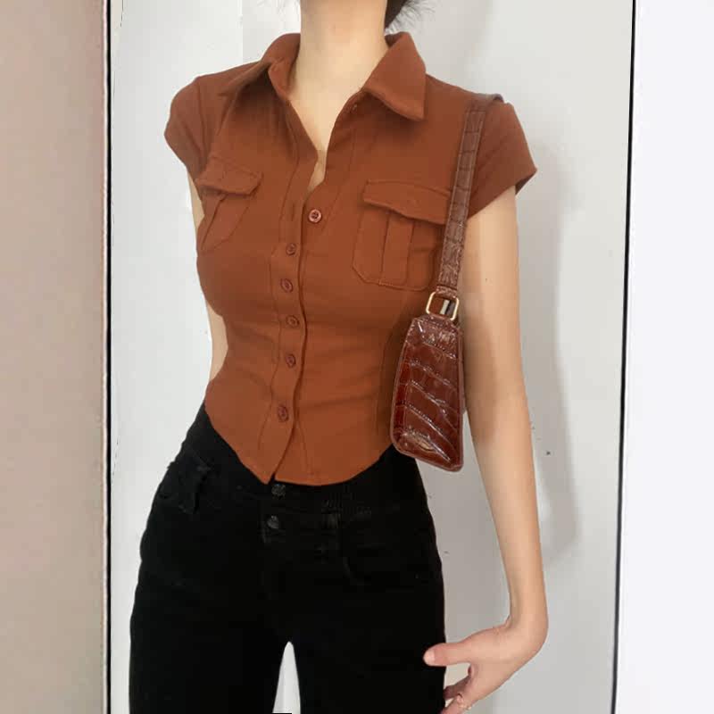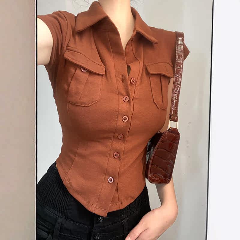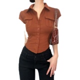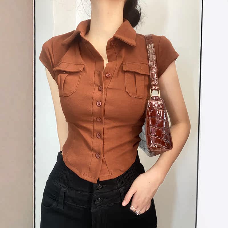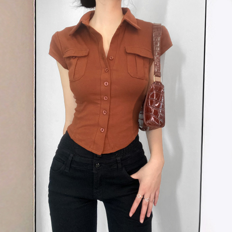 Небольшая дизайнерская ретро милая короткая рубашка, футболка с коротким рукавом, коллекция 2022, европейский стиль, тренд сезона, воротник поло, облегающий крой, короткий рукав