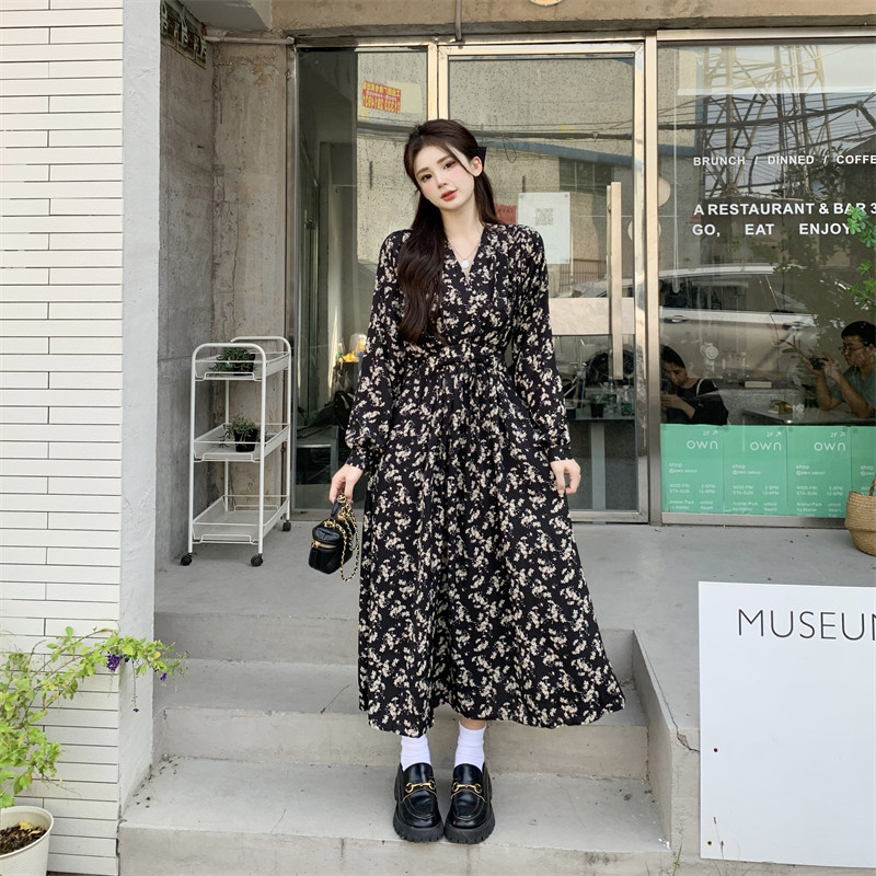 Ретро длинная юбка, длинное платье, осенняя, большой размер, премиум класс, французский ретро стиль, V-образный вырез, цветочный принт, высокая талия, средней длины