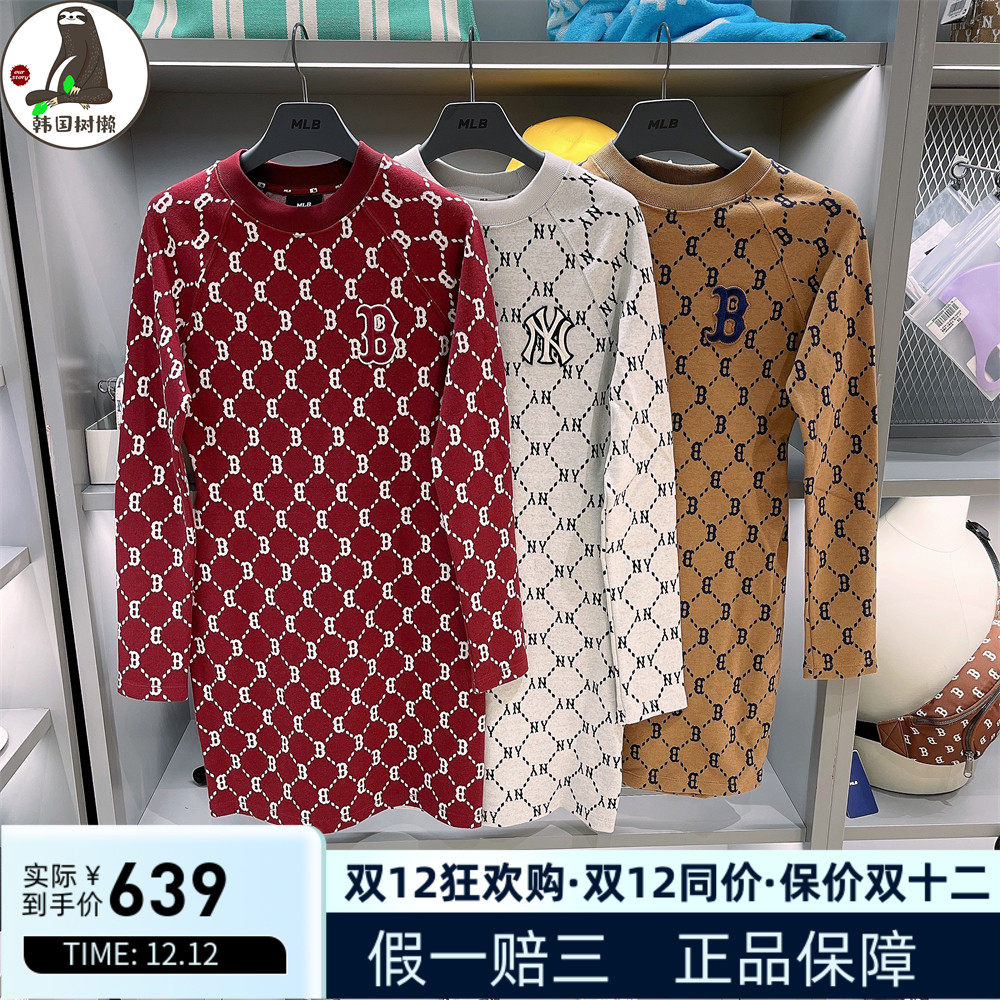 [MLB长袖连衣裙圆领短款老花NY字母满标LA潮牌B满印韩国正品代购]