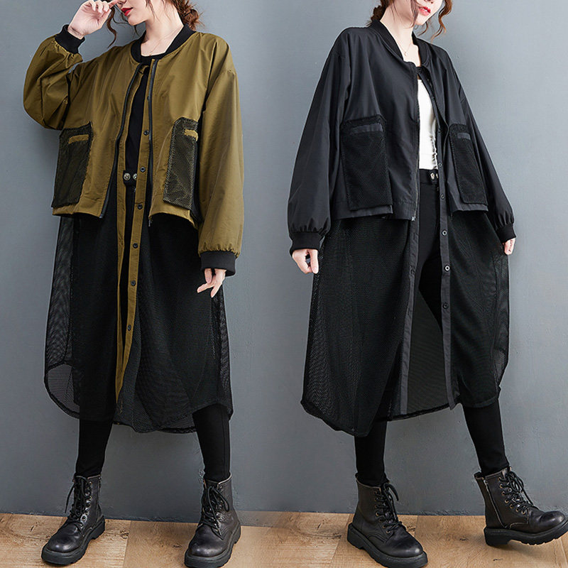 Дизайнерский лонгслив, длинный плащ, свободный крой, тренд сезона, юбка из сетки, V-образный вырез, большой размер, средней длины
