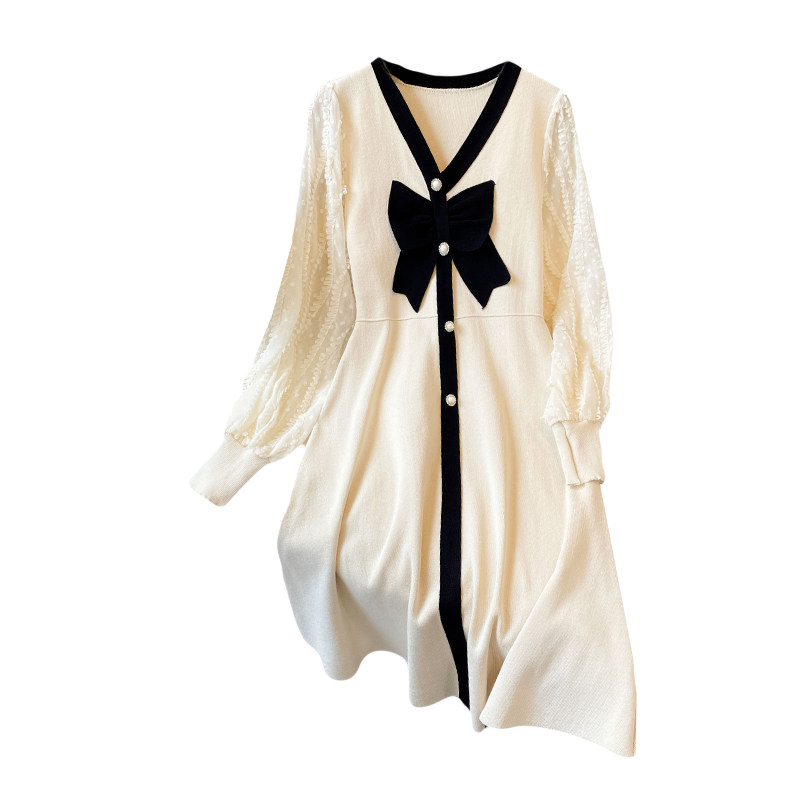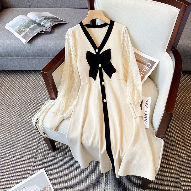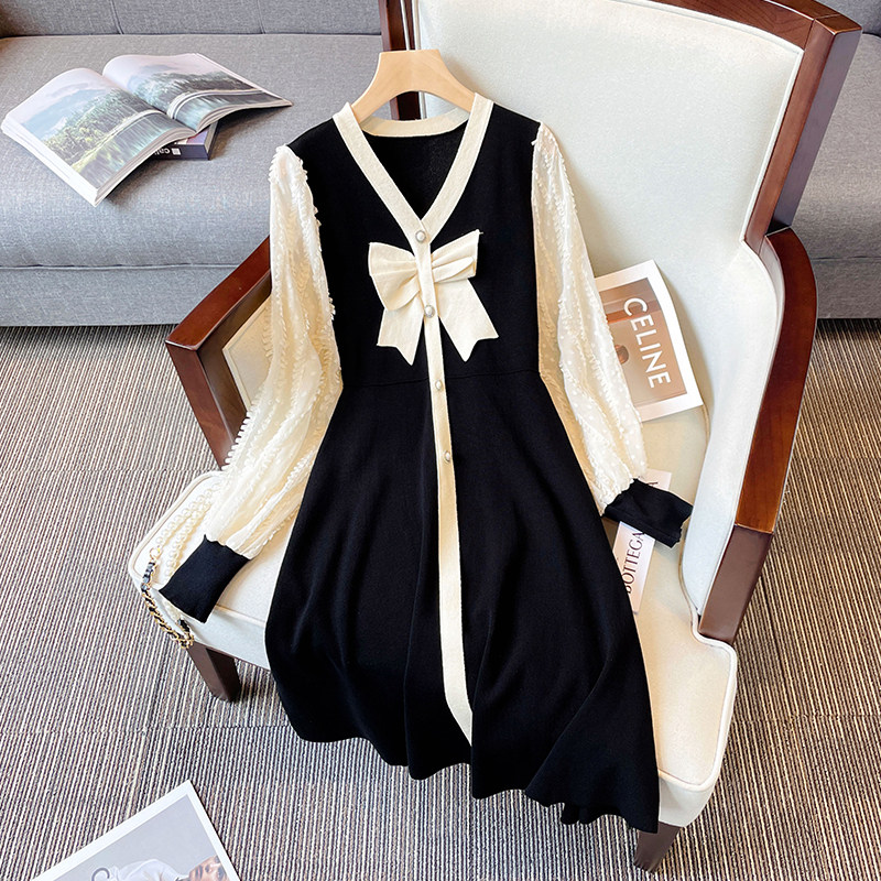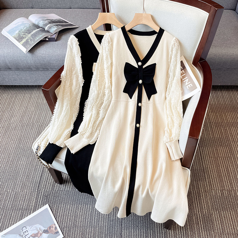 Лонгслив, модное платье с бантиком, осенняя юбка, большой размер, V-образный вырез, осенний