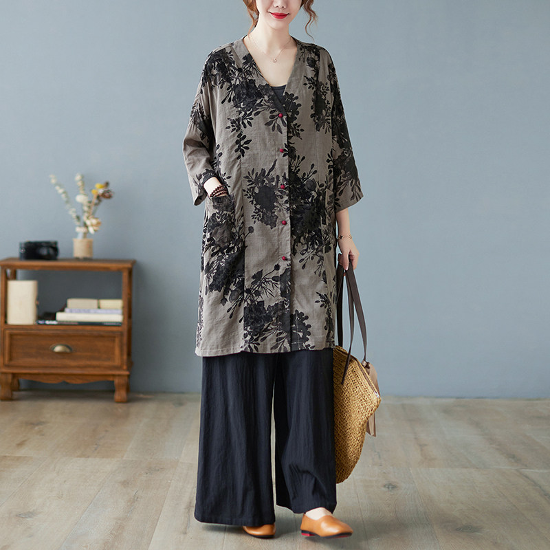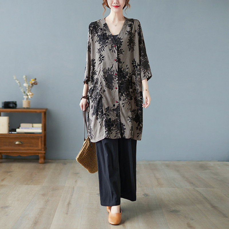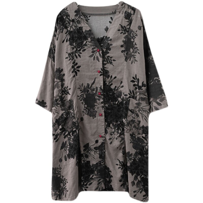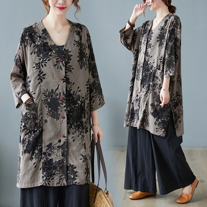Кардиган, длинная осенняя рубашка, из хлопка и льна, V-образный вырез, большой размер, средней длины