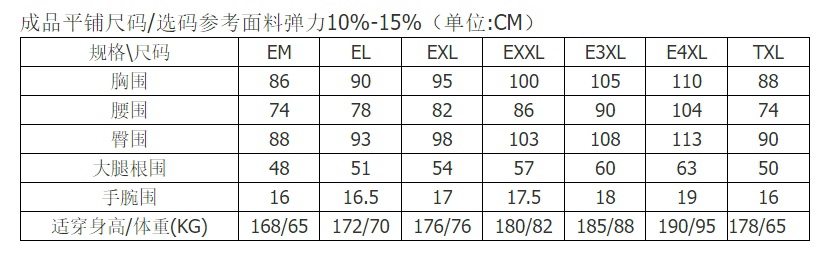 | Размер: | EM(168/65), EL(174/72), EXL(180/78), EXXL(186/84), E3XL(192/90), Е4XL (198/98), TXL высокий и худой (178/65) |