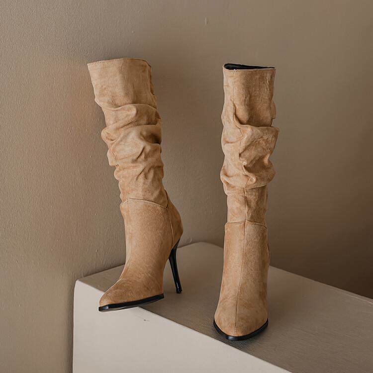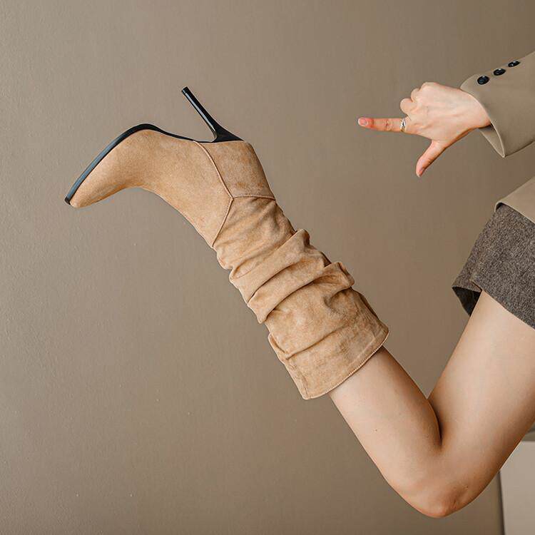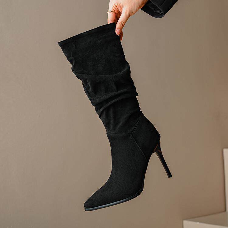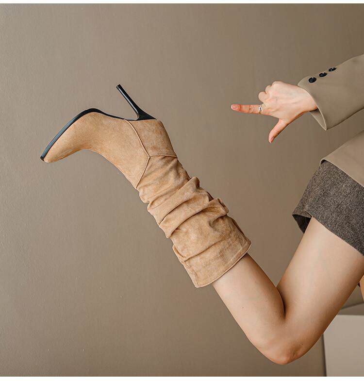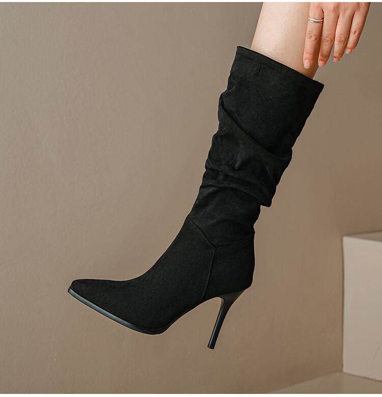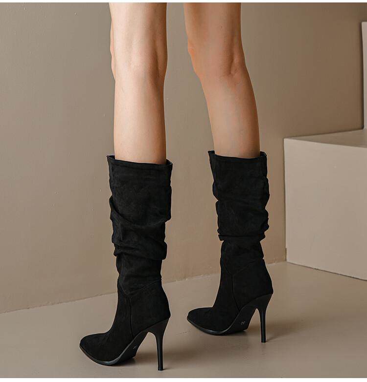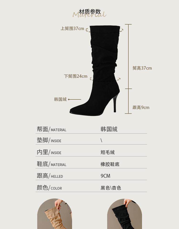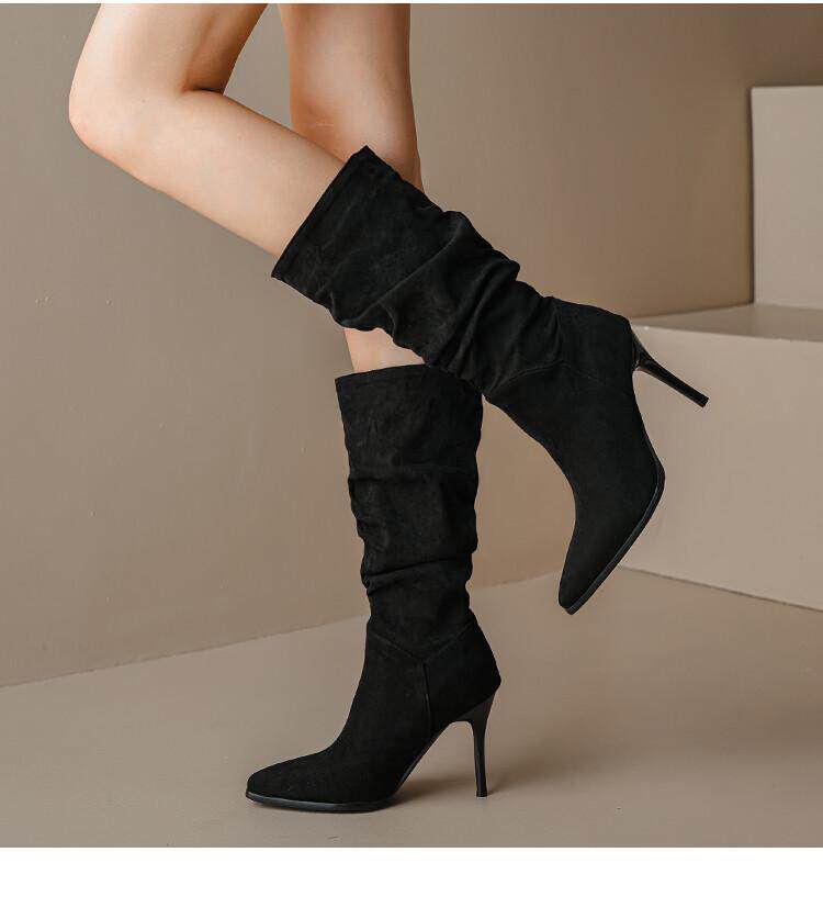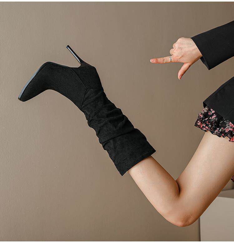 Длинные женские сапоги, толстые сапоги на тонком каблуке высотой не выше колена, плиссированные, с острым носком ворса, европейские и американские эластичные сапоги, сапоги до середины икры на высоком каблуке.