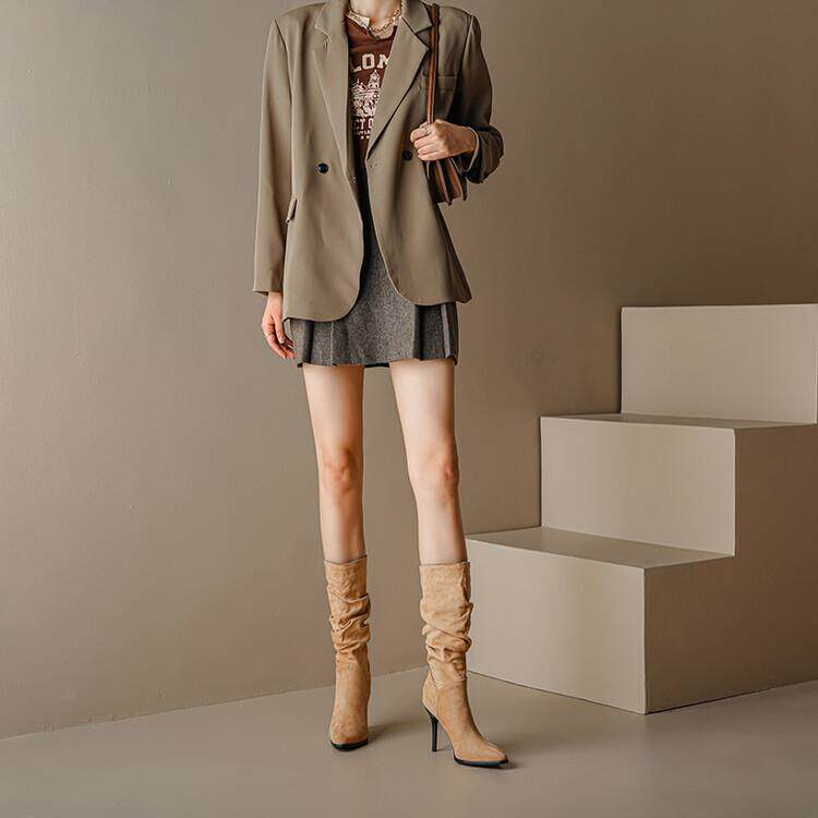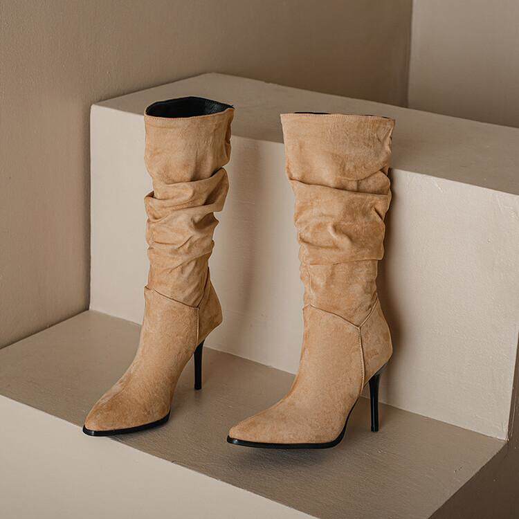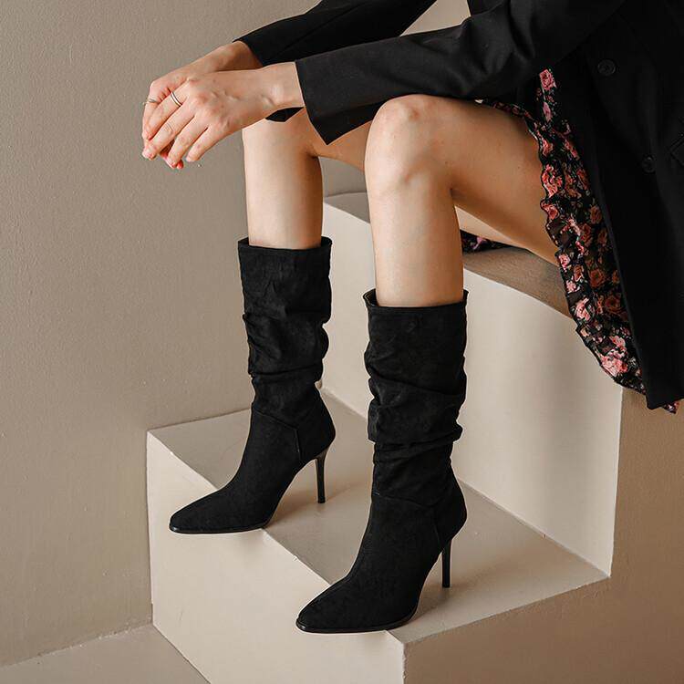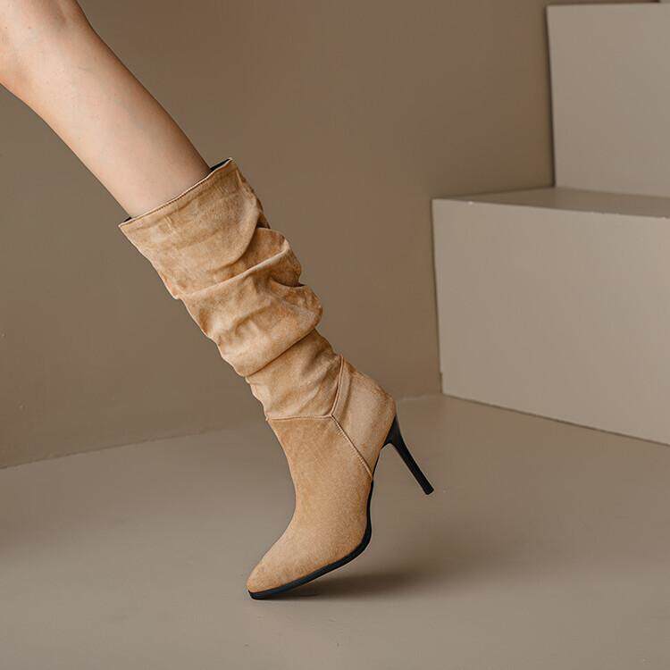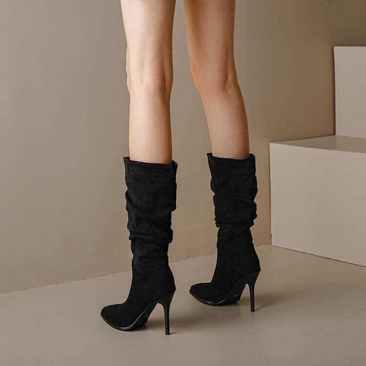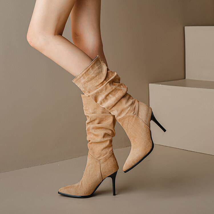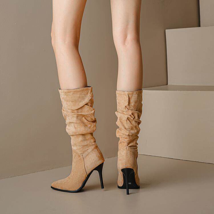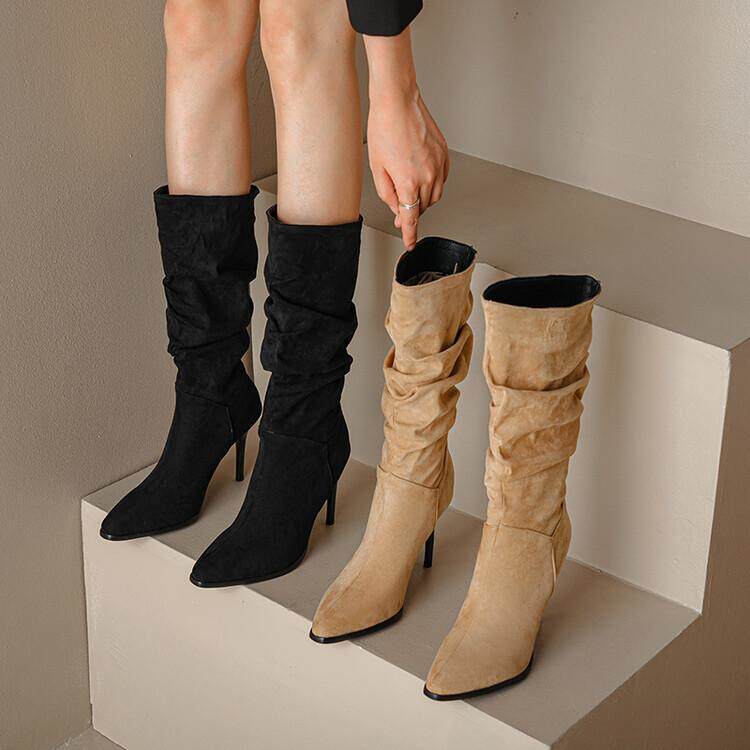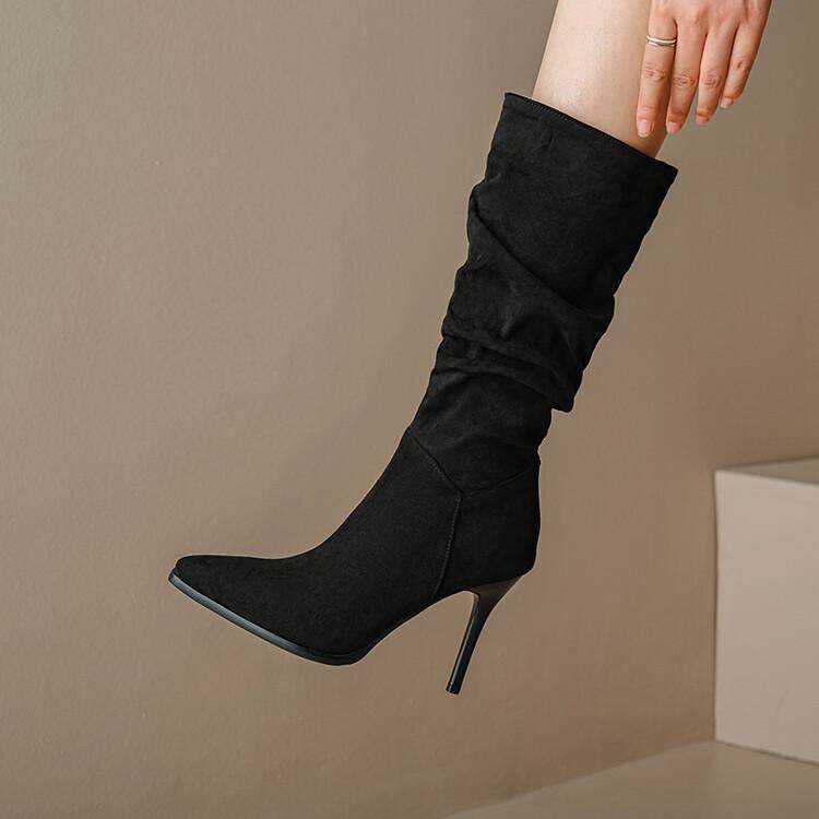 Длинные женские сапоги, толстые сапоги на тонком каблуке высотой не выше колена, плиссированные, с острым носком ворса, европейские и американские эластичные сапоги, сапоги до середины икры на высоком каблуке.