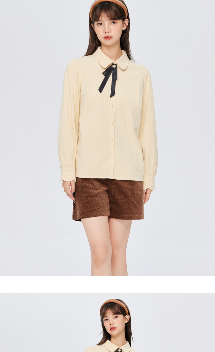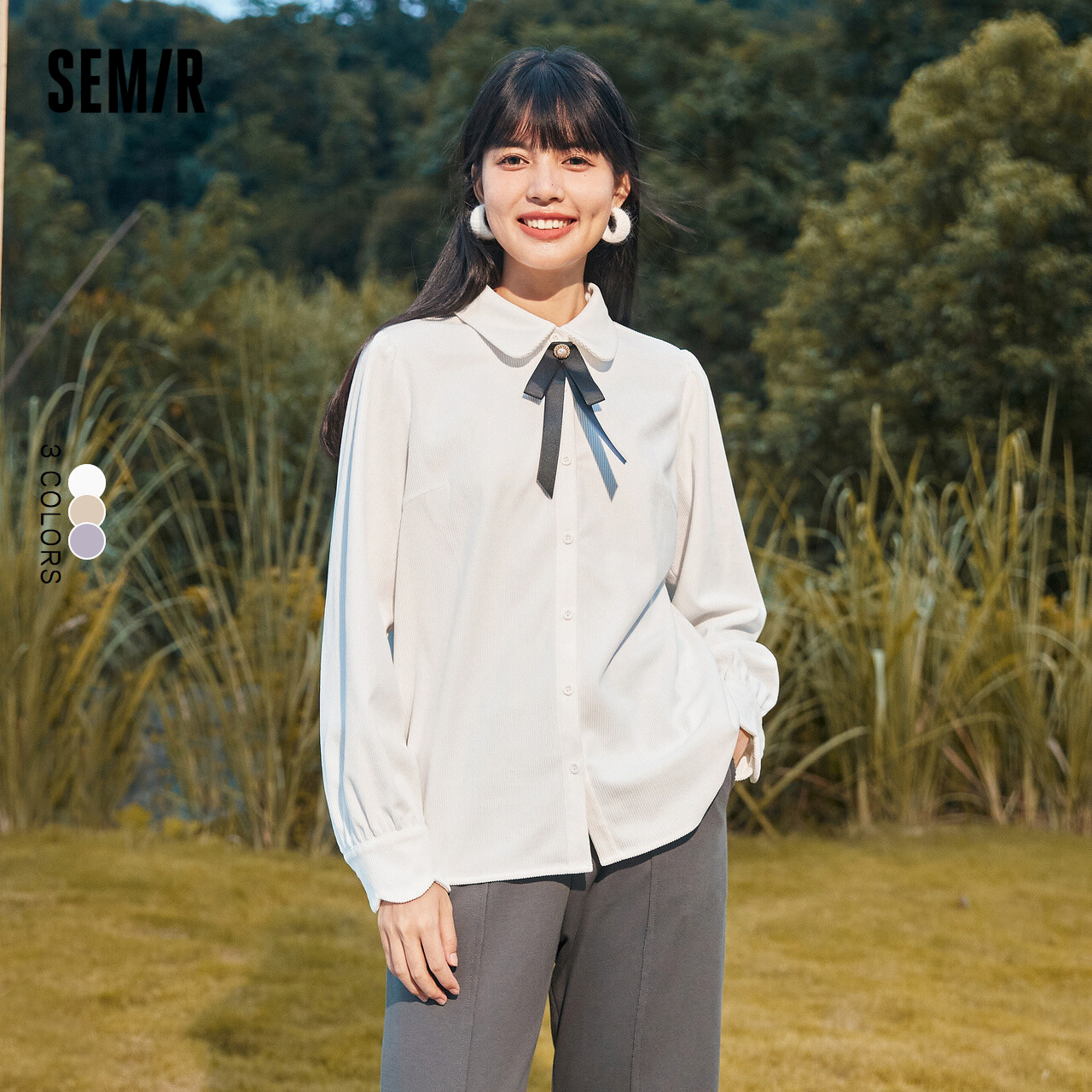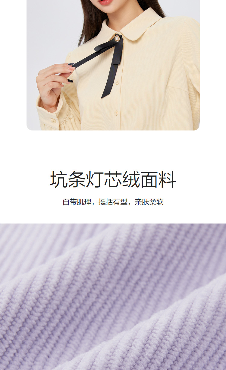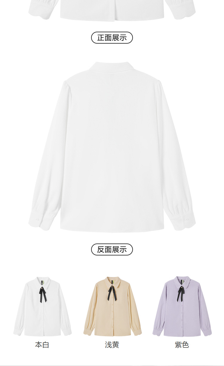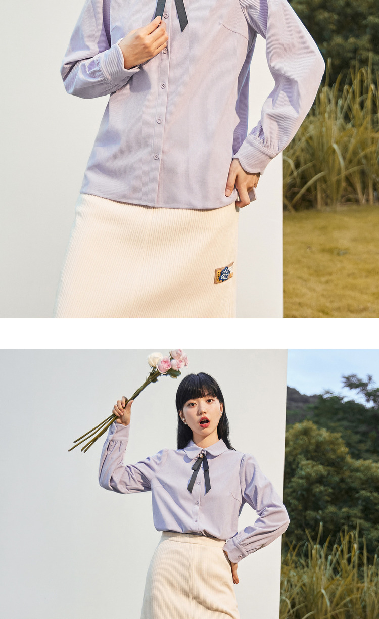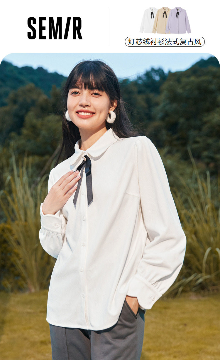 Semir, зимняя белая вельветовая сиреневая рубашка с бантиком, коллекция 2022, рукава фонарики, французский стиль