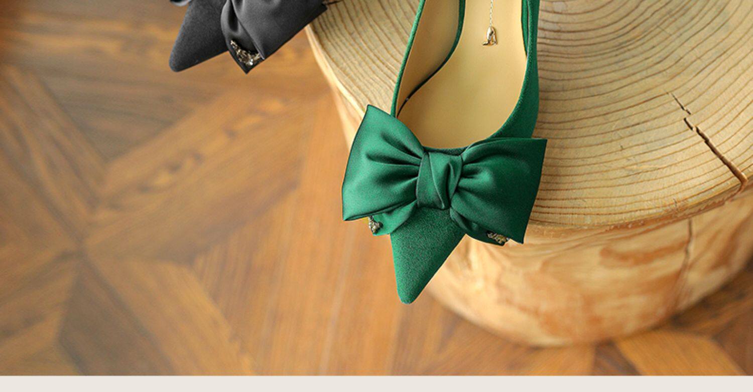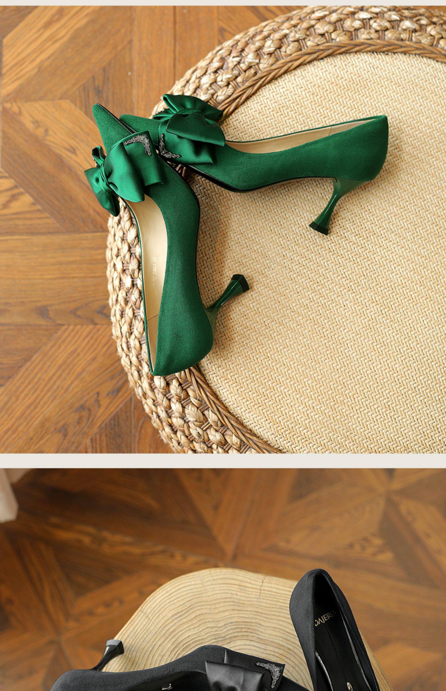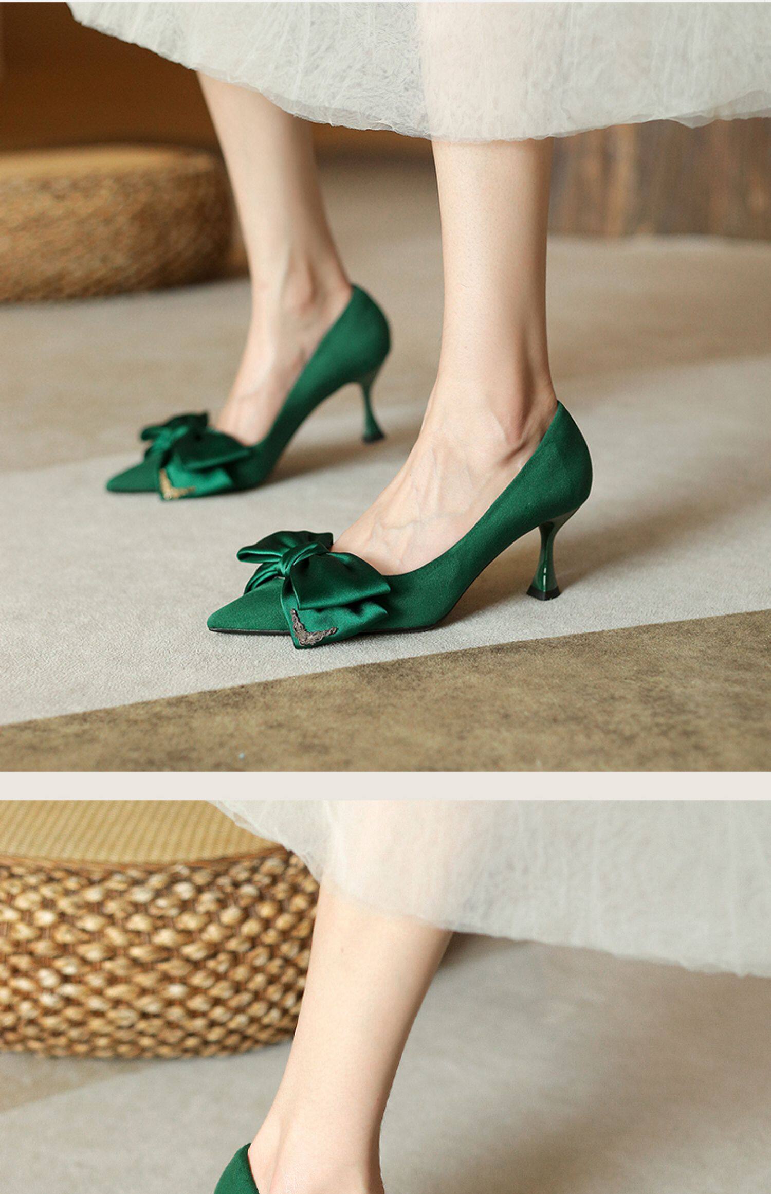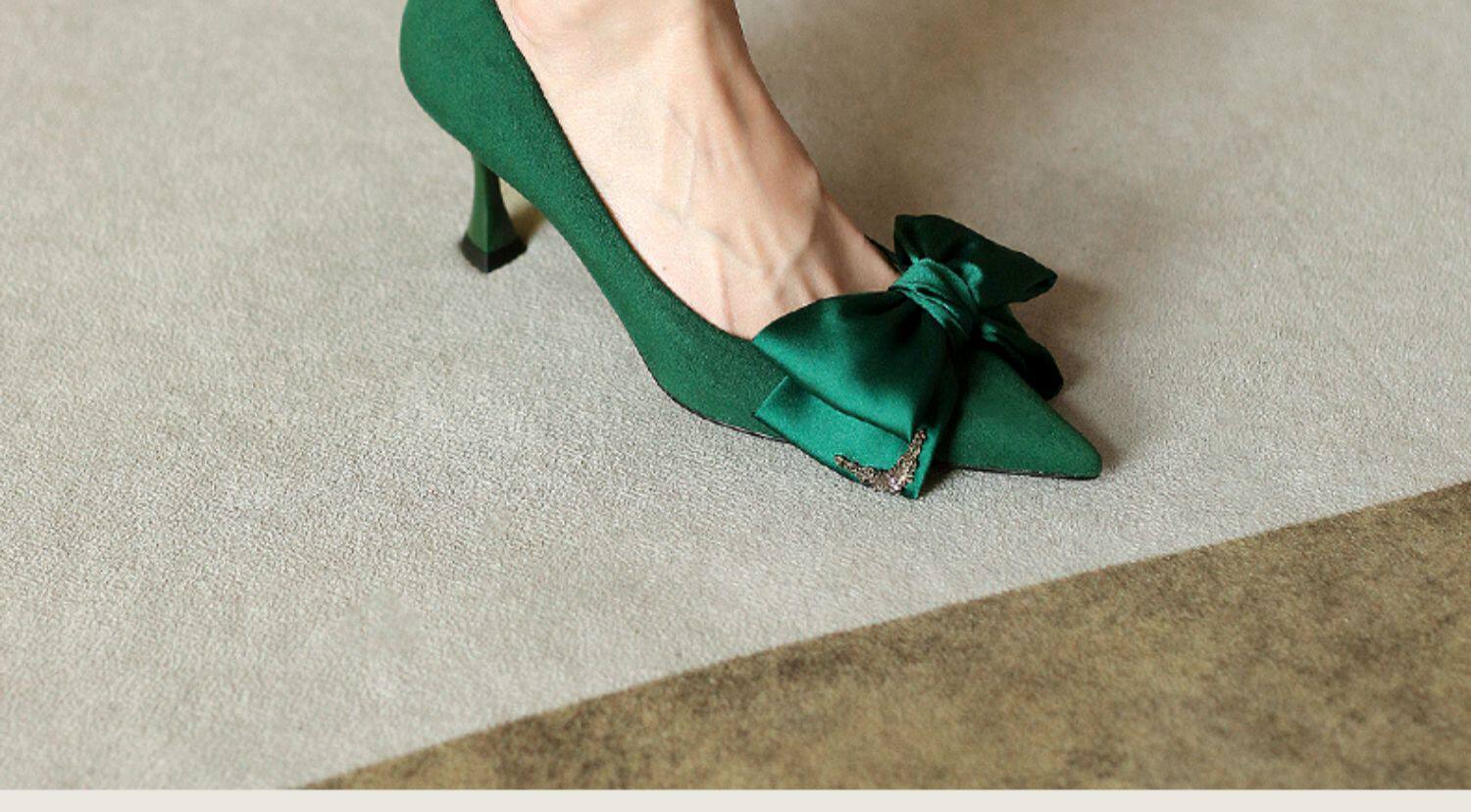Зеленые туфли на высоком каблуке с бантиком, 2023, осенние, тренд сезона, из натуральной кожи, французский стиль