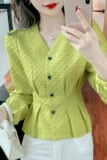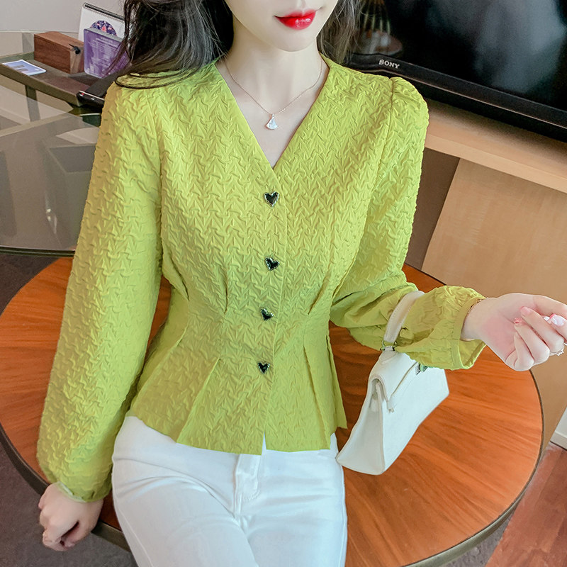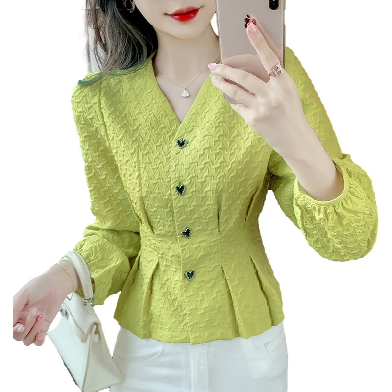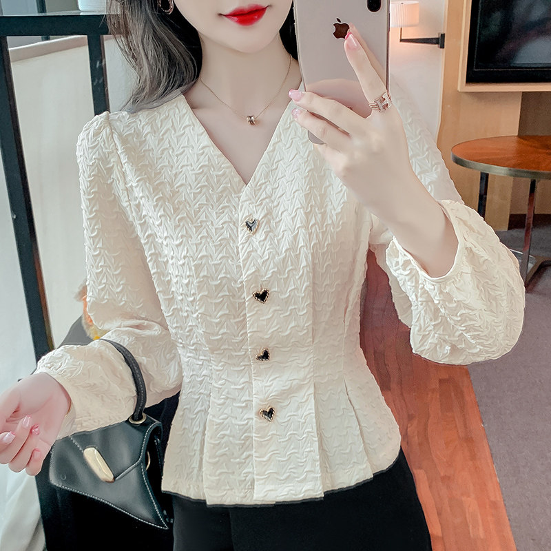 Весенняя небольшая дизайнерская рубашка, корсет, футболка, в стиле Шанель, французский стиль, V-образный вырез, тренд сезона, облегающий крой, рукава фонарики