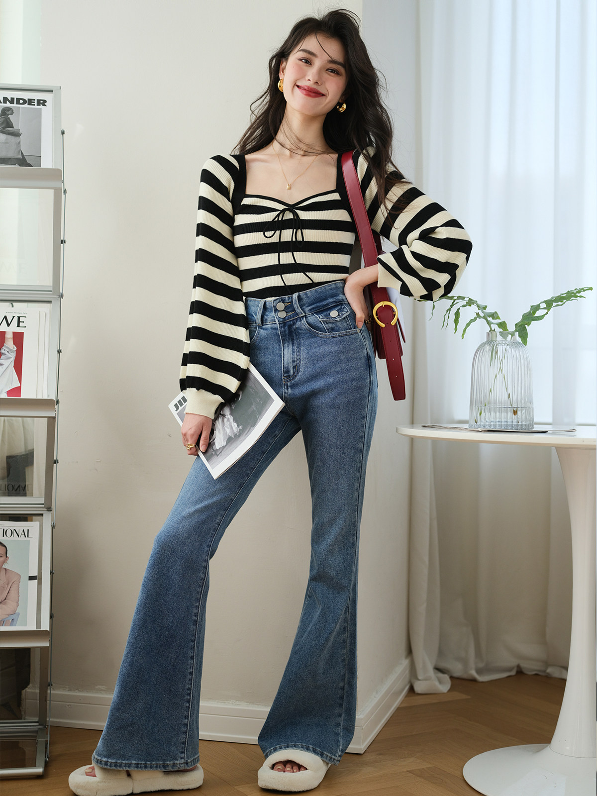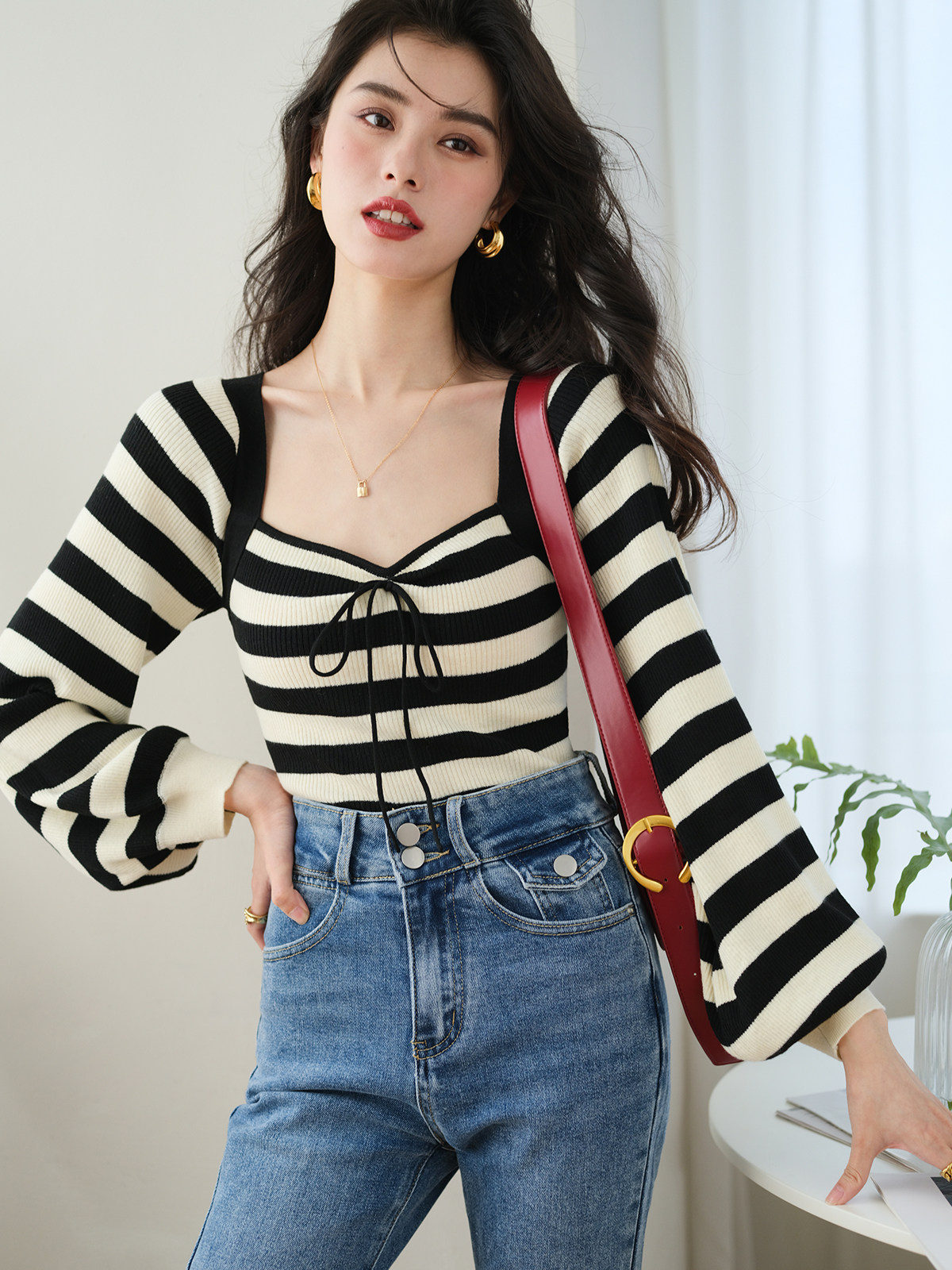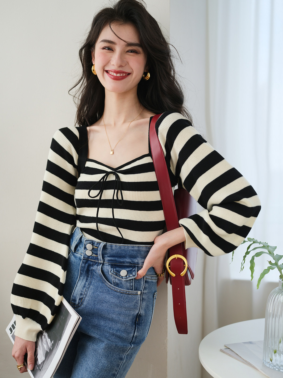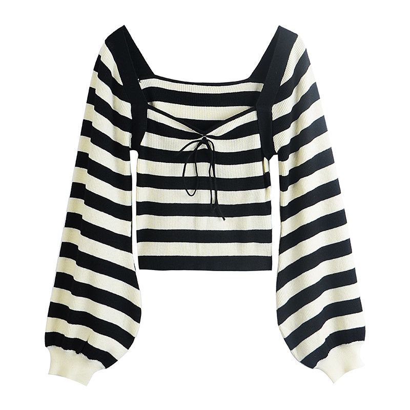 Ретро трикотажный фонарь, осенний дизайнерский лонгслив, свитер, квадратный вырез, 2023