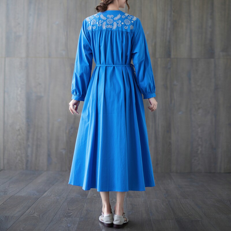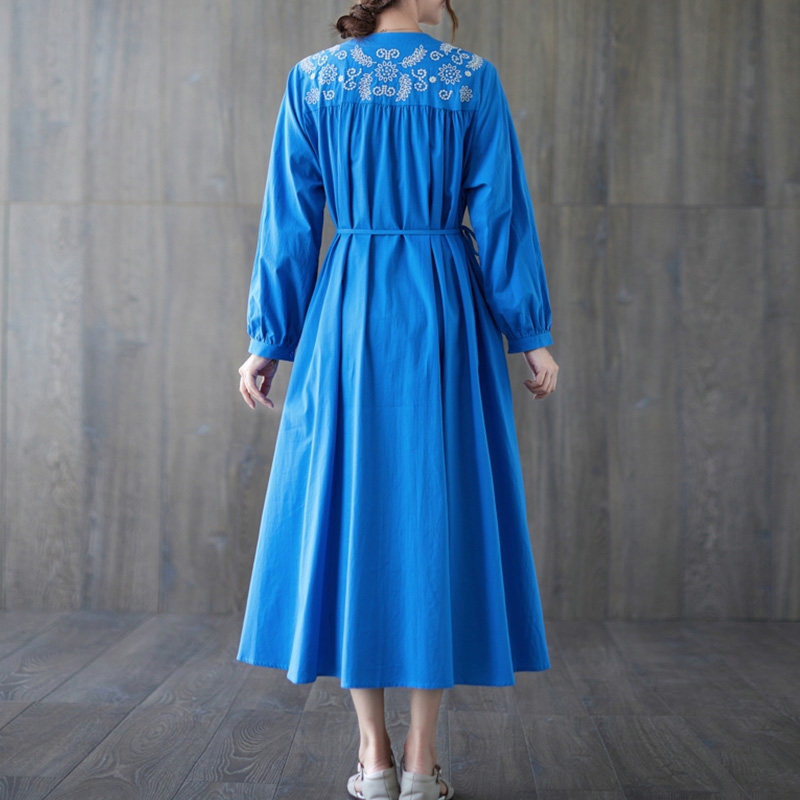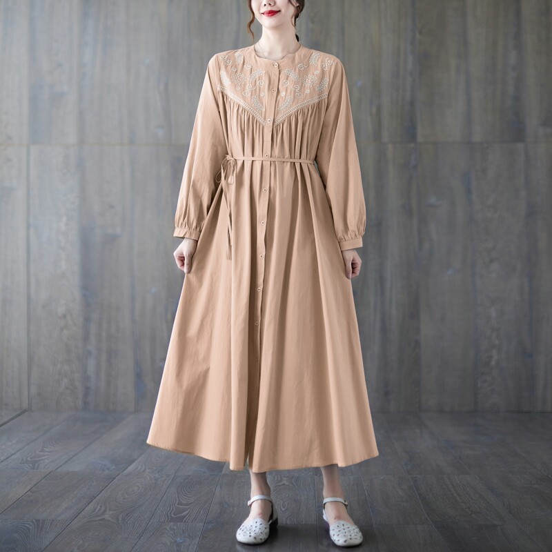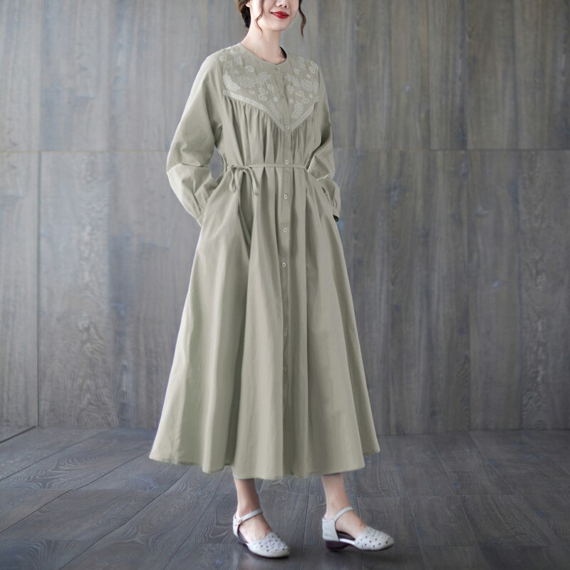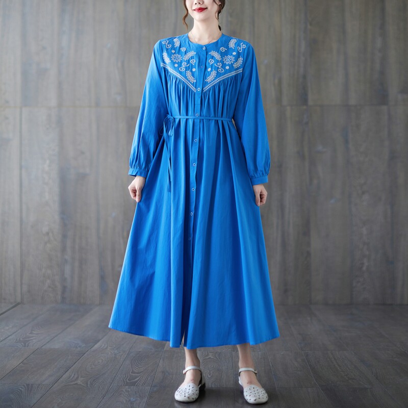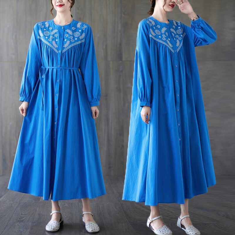 Вышивка, длинная юбка, модный осенний лонгслив с круглым воротником, платье, свободный крой, с вышивкой, большой размер
