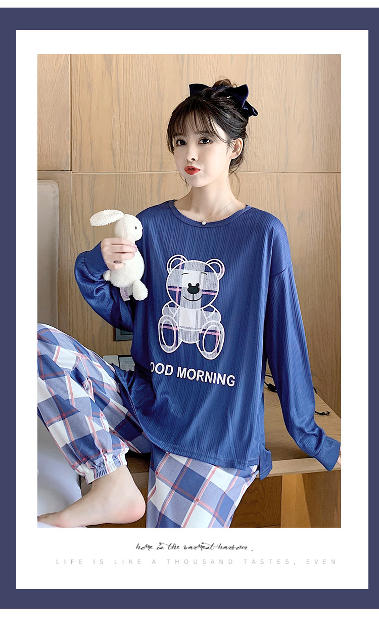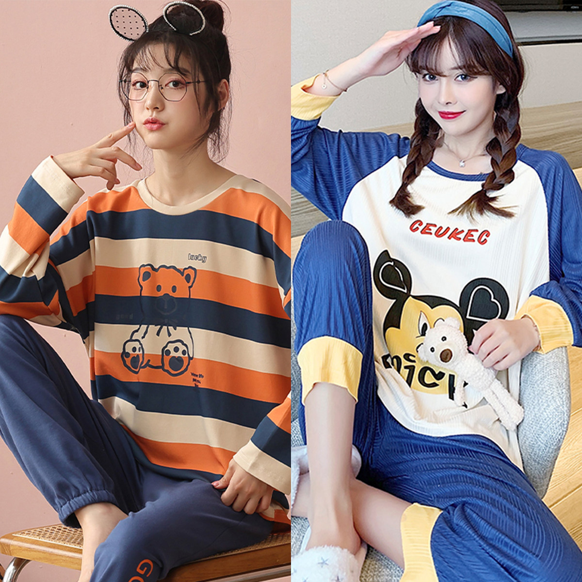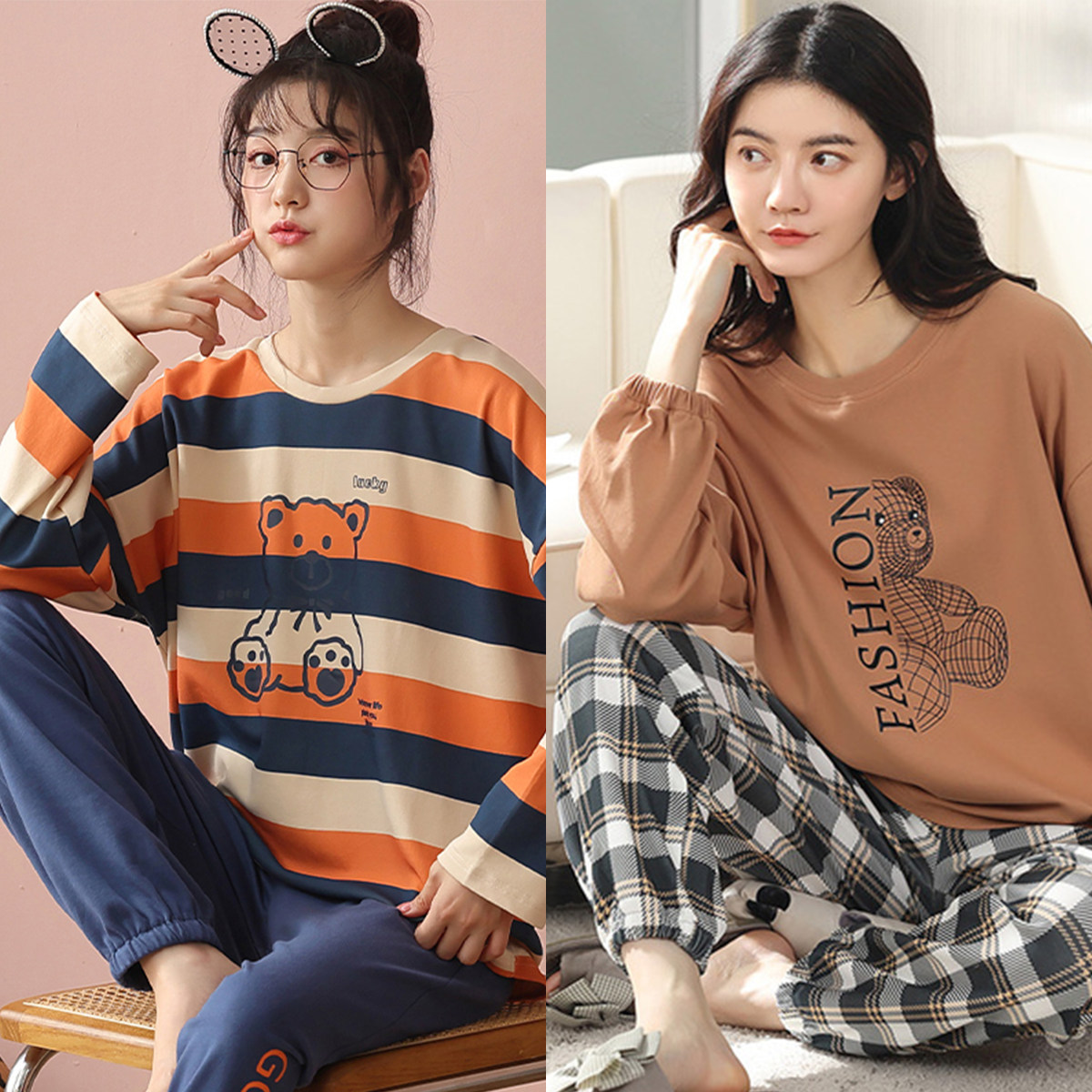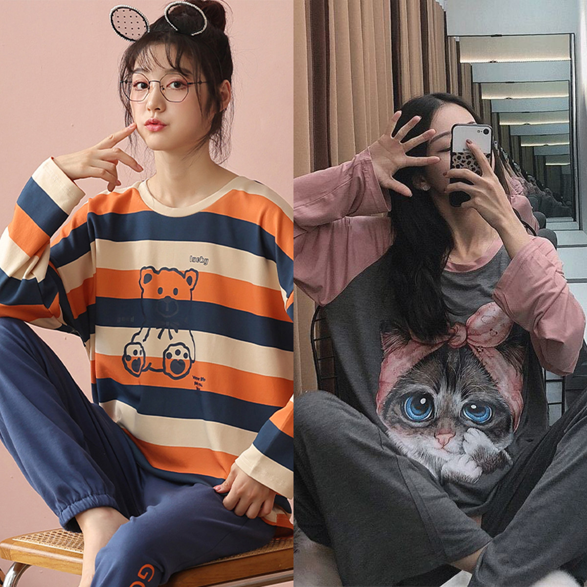 Осенняя демисезонная пижама, хлопковый свежий лонгслив для отдыха, демисезонный комплект, в корейском стиле, большой размер
