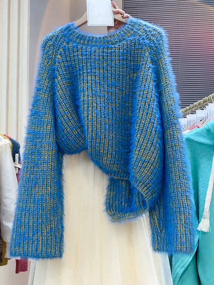 Брендовый синий осенний свитер, свободный крой