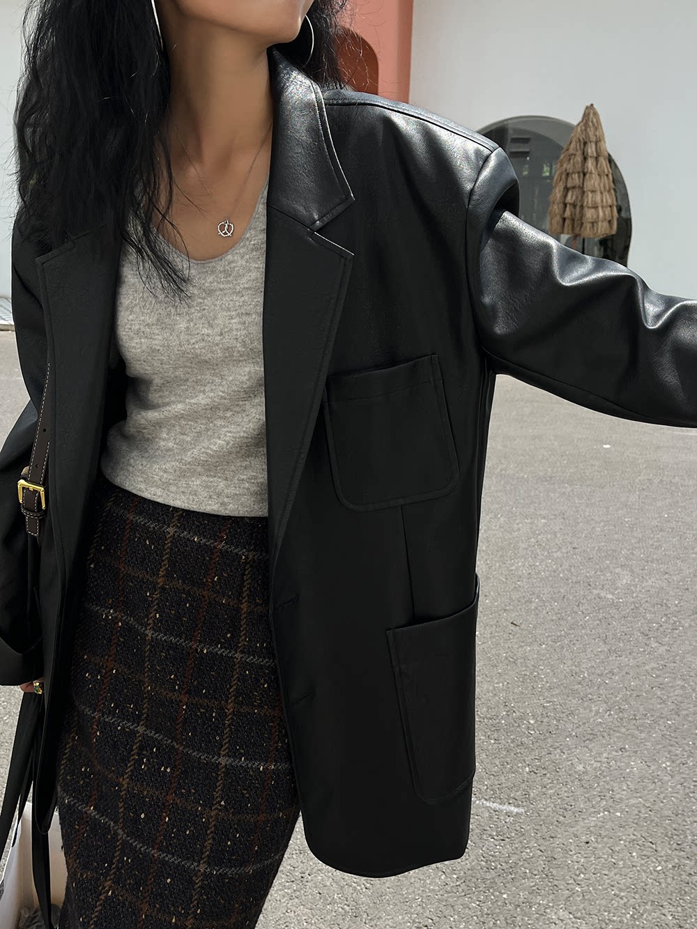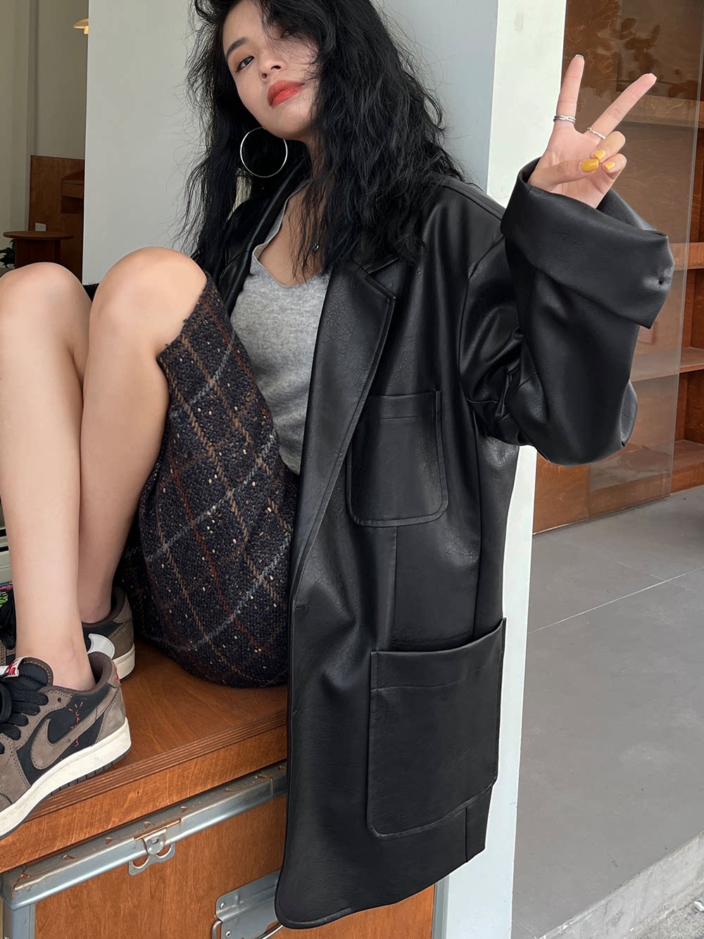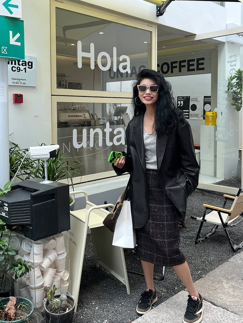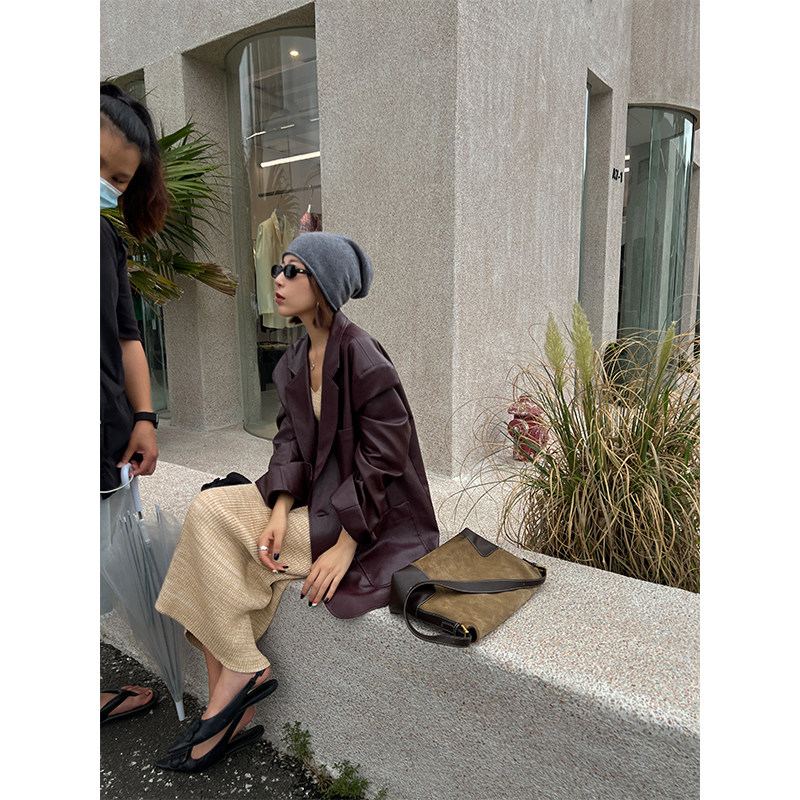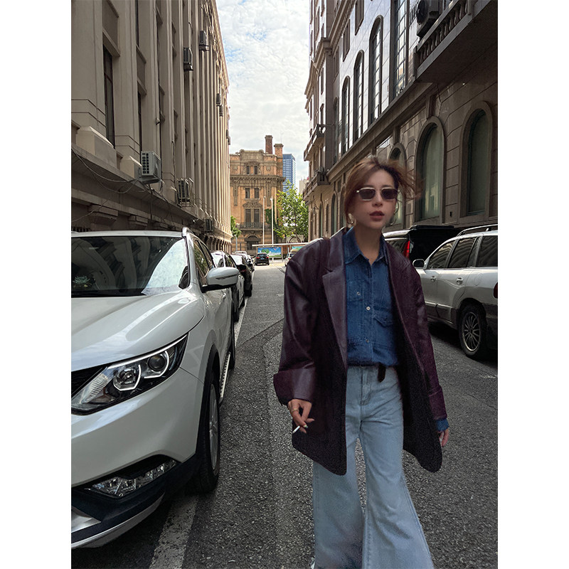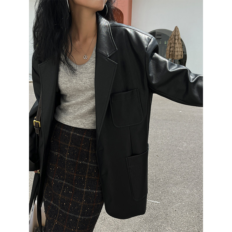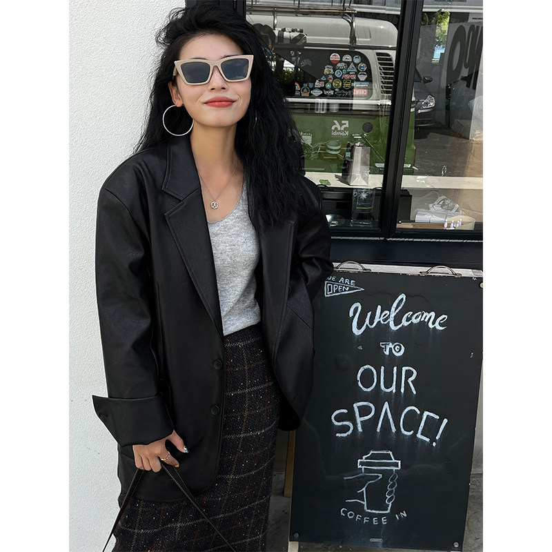 Костюм, осенняя ретро полиуретановая куртка, коллекция 2023, изысканный стиль, оверсайз